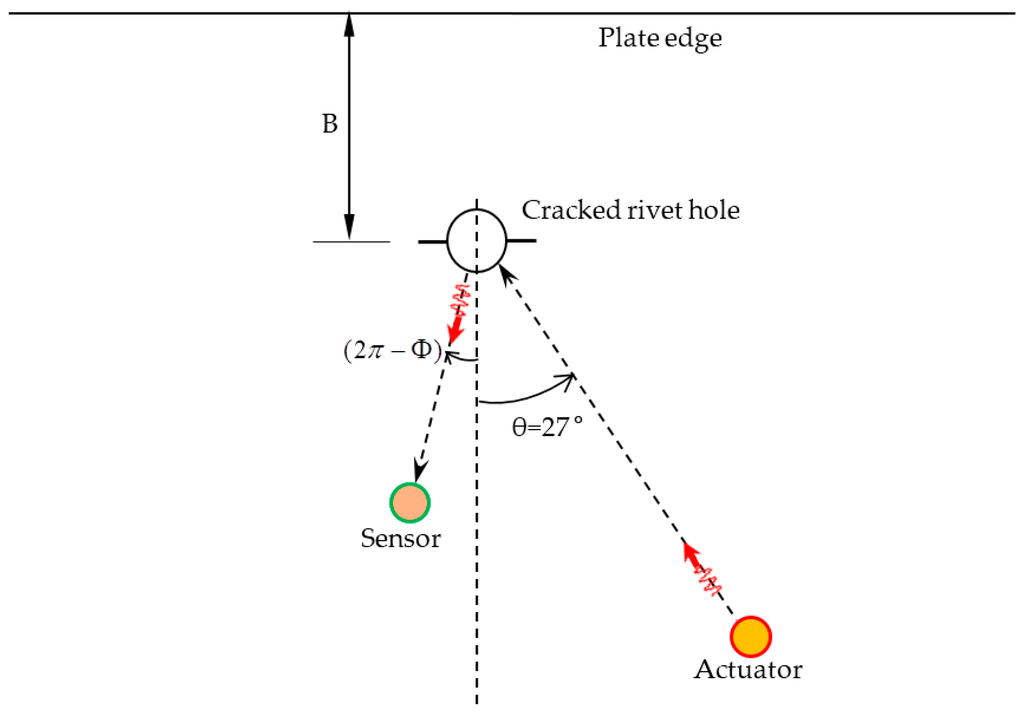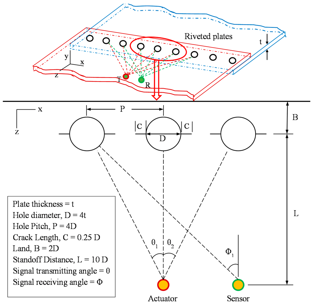 A multiple-rivet-hole lap joint with active transmitting-sensing sensors of an SHM system is illustrated in Figure 1. When electrical voltage is supplied to the piezoelectric transmitter (actuator), it generates mechanical excitation in the structure and produces Lamb waves that propagate in the structure. The Lamb waves interact with the damages, which act as the secondary sources of guided waves. The scattered guided waves propagate in the structures and are received by the piezoelectric sensor. The actuator dispatches Lamb waves to each of the rivet holes at a certain angle that can be calculated from the standoff distance (L) and pitch (P) of each rivet hole (Figure 1). The scattering phenomenon depends on the direction () of incident Lamb waves as well as the azimuth direction () around the damage (the azimuth direction corresponds to the sensor placement direction).