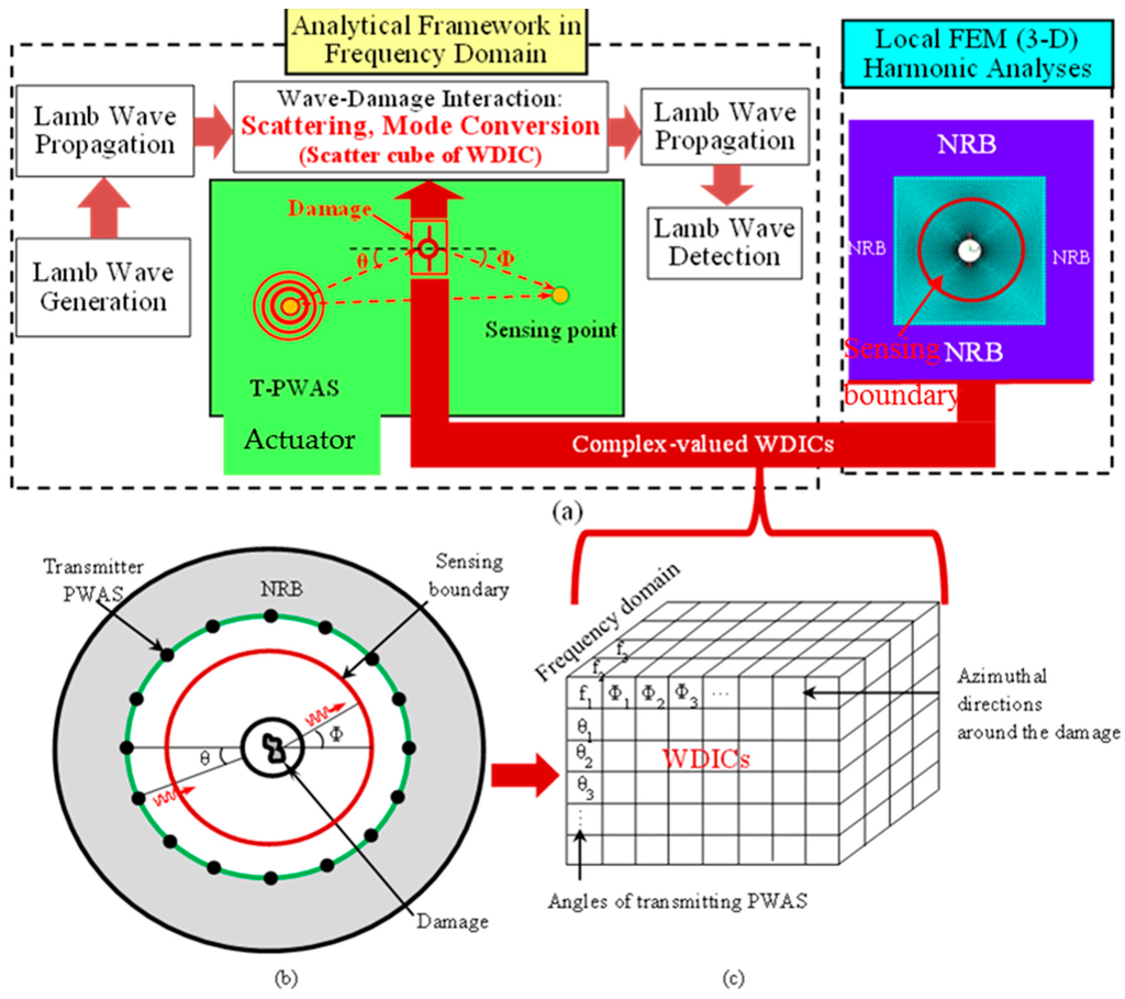 (a) Framework of the combined analytical and finite element approach (CAFA); (b) Representative model of the damage for FE analysis; (c) “Scatter cube” of wave damage interaction coefficient (WDIC).