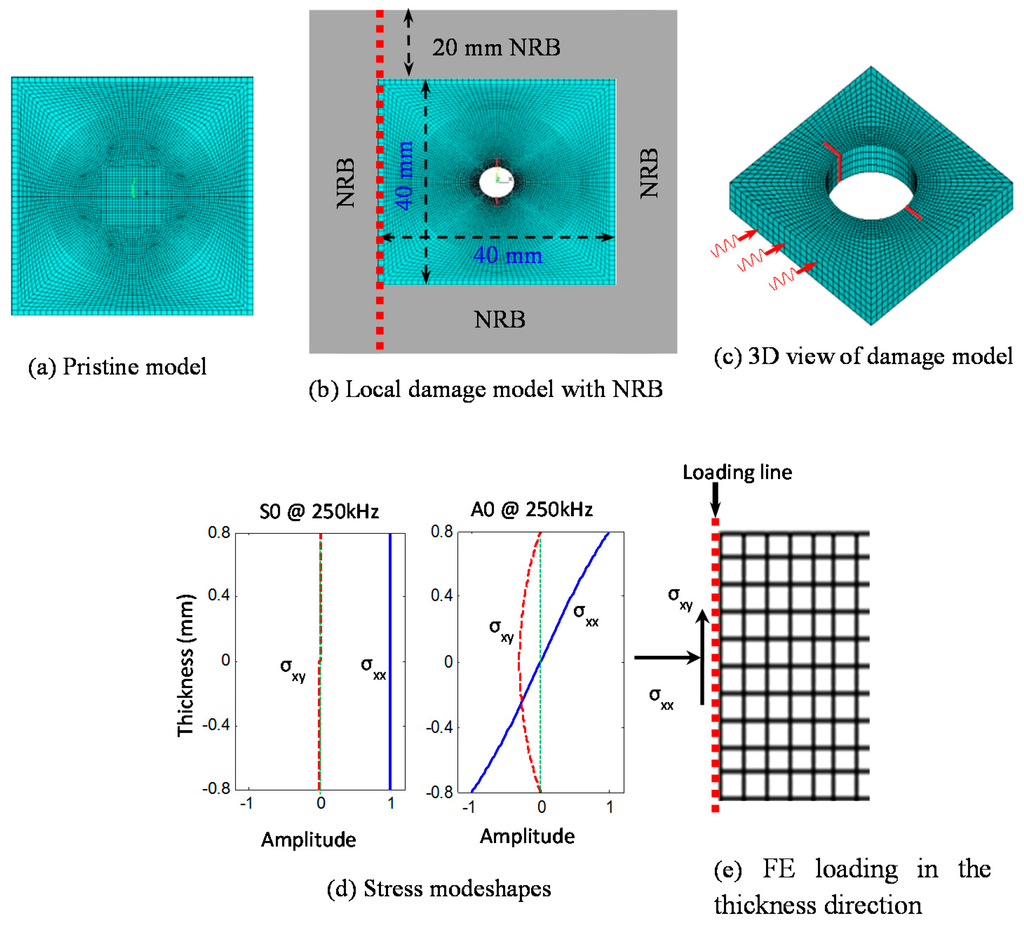 Illustration of local finite element method (FEM) modeling (a) Pristine model; (b) Local damage model with NRB; (c) 3D view of damage model; (d) Stress modeshapes; (e) FE Loading in the thickness direction.