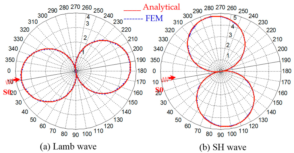 The analytical WDIC profiles for the Lamb wave and SH wave for a simple pristine plate has been derived by Bhuiyan et al. [27], who showed that WDIC profiles follow ideal double-circled shape. The finite element result is compared with the analytical result as shown in Figure 4. The finite element result shows very good agreement with the analytical result.