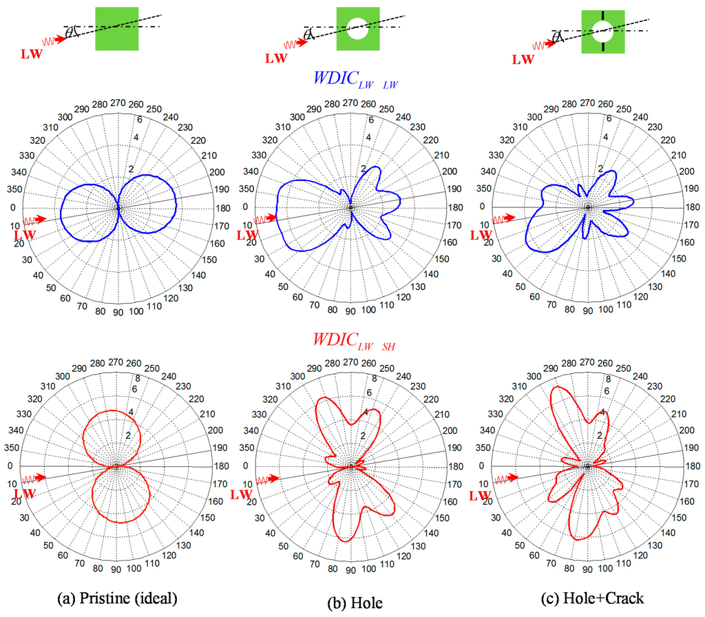 Alteration of wave damage interaction coefficient (WDIC) profiles of scattered Lamb and shear horizontal (SH) waves with different damage conditions: (a) Pristine; (b) Hole; (c) Hole + Crack.