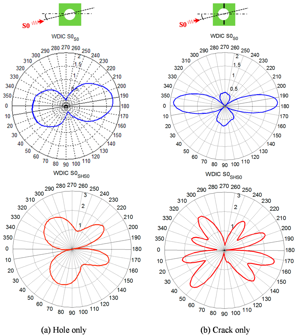 The polar plot of WDIC (WDIC profile) of the scattered S0 Lamb mode and SH mode due to incident S0 Lamb mode at is shown in Figure 5. An arbitrary frequency was selected for illustration purposes only. When there is no damage (pristine) in the plate, there is no scattered wave field and the WDIC profile is an ideal double-circled shape. When there is a rivet hole in the plate, the presence of scattered field makes distortion of the ideal shape of WDIC profile as shown in Figure 5b and the profile is symmetric about the line of incidence since the rivet hole is symmetric about the line of incidence. When there is damage (butterfly cracks) in the rivet hole, the additional scattered waves due to damage provide additional distortion to the WDIC profile. The WDIC profile for hole + crack is no more symmetric (Figure 5c) since the damaged rivet hole (hole + crack) is not symmetric about the line of incidence. In order to clearly identify the effect of damage in the plate, the scattered fields can be separated from the total fields. To find out the scattered field due to the presence of the hole, incident wave fields (wave fields due to pristine plate) needs to be subtracted from the total wave field (incident + scattered) and the corresponding WDIC profile of the hole (only) is plotted in Figure 6a. Similarly, to find out the scattered field due to the presence of the crack (only), the scattered wave field of the hole (only) and the incident wave fields needs to be subtracted from the total wave fields (due to hole with crack + incident). The corresponding WDIC profile of scattered S0 Lamb mode and SH wave for the crack (only) is plotted in Figure 6b. The WDIC profiles indicate that the magnitude of WDIC reaches the larger value at certain azimuth angles .