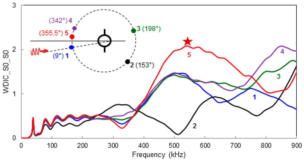 Frequency domain variation for a certain Lamb wave mode (S0 mode) incident from a particular direction () to the cracked rivet hole is shown in Figure 7. Five different azimuthal locations are picked arbitrarily to show the frequency domain variation of the WDICs. It can be noticed that at a certain location, a certain frequency of excitation provides the largest magnitude of WDIC. This frequency may be termed as sensitive frequency of that location. However, at a certain sensitive frequency, all the azimuthal locations are not necessarily equally sensitive. Thus the selection of frequency of excitation as well as the location is important in order to capture the damage signature. By comparing all azimuthal location, it is possible to select a certain frequency that corresponds to the highest magnitude of the WDIC, for example, in this particular case, the star marked frequency () can be the most sensitive excitation frequency at location 5 (“most sensitive location”).