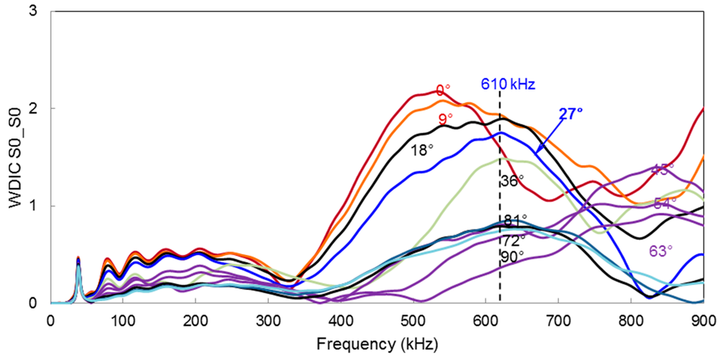 For example, when S0 Lamb wave mode hit the cracked rivet hole at , the excitation center frequency corresponds the highest WDIC. In Section 7, we will show how the magnitude of WDIC affects the physical signal.