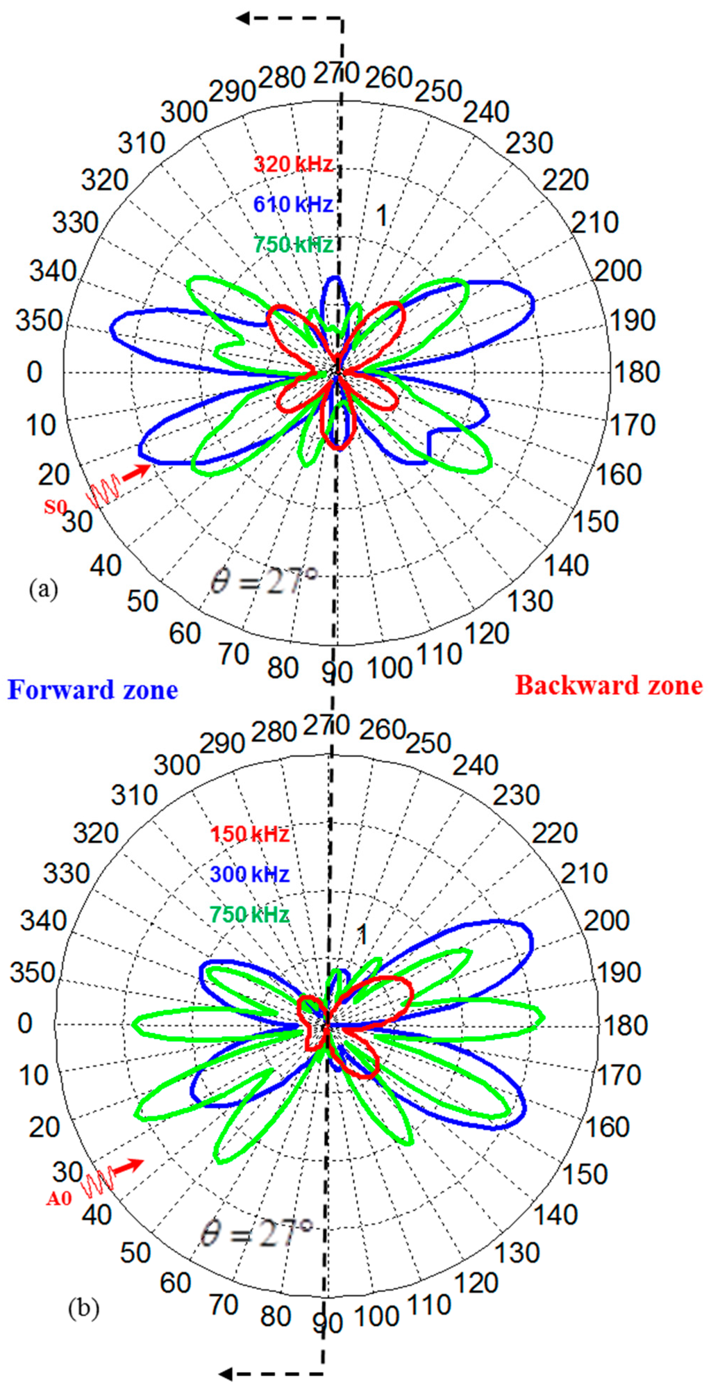 The polar plot refers to the azimuthal variation of WDIC and can be used to identify the locations where WDIC reaches the maximum. The azimuthal variation of WDIC for symmetric and antisymmetric Lamb wave incident at 27° to the rivet hole cracks are shown in Figure 9. As the frequency changes, the WDIC profile for both symmetric and antisymmetric Lamb wave changes. It is possible to get multiple sensitive locations around the damage for a certain frequency of transmitting signal.