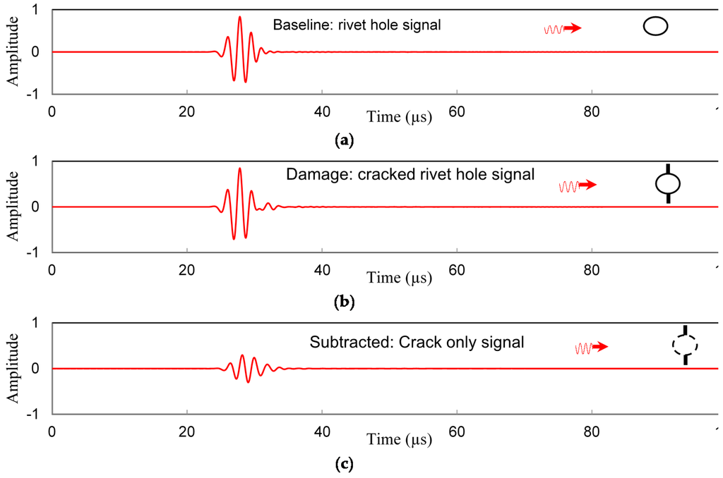 In this section we will show how the timedomain signals varies with WDIC and the selection of the frequency and locations of the sensors. Three count Hanning window modulated signal from a transmitter PWAS is used. The actuator is located at 100 mm away from the damage and the receiver is 30 mm away from the damage. The signal extraction process is illustrated in Figure 10. When there is a hole in the plate, the signal in the receiver PWAS behaves as shown in Figure 10a, and in presence of cracks in the rivet holes, the receiver signal changes as shown in Figure 10b. By subtracting the two signals, the receiver signals due to the cracks is be obtained as shown in Figure 10c. This illustration is shown for a particular frequency of 538 kHz and when Lamb waves incident horizontally to the rivet hole with cracks.