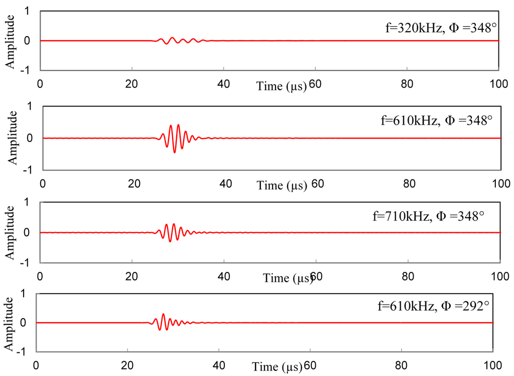 The effect of different frequency–location parameters on the receiver signal is shown in Figure 12. The four different sets of parameter are selected based on Figure 8 and Figure 9. Transmitting of the S0 Lamb mode from an actuator at is used for this illustration. Figure 8 shows that at most sensitive location (), WDIC reaches the maximum at around 610 kHz frequency. At the same location, two other frequencies (320 kHz, 710 kHz) are chosen to show the differences in the receiver signals as illustrated in Figure 12. It shows that 610 kHz excitation frequency gives the strong sensing signal at that location (), hence it becomes the most sensitive frequency. Additionally, by selecting the most sensitive frequency (610 kHz), if we change the location of the receiver sensor where WDIC magnitude is smaller (Figure 9) we can end up with a weak signal. Thus, for a particular Lamb wave incident (), the optimum center frequency of excitation (610 kHz) and location of the receiver sensor () can be selected for better detection of the cracks in the rivet holes.