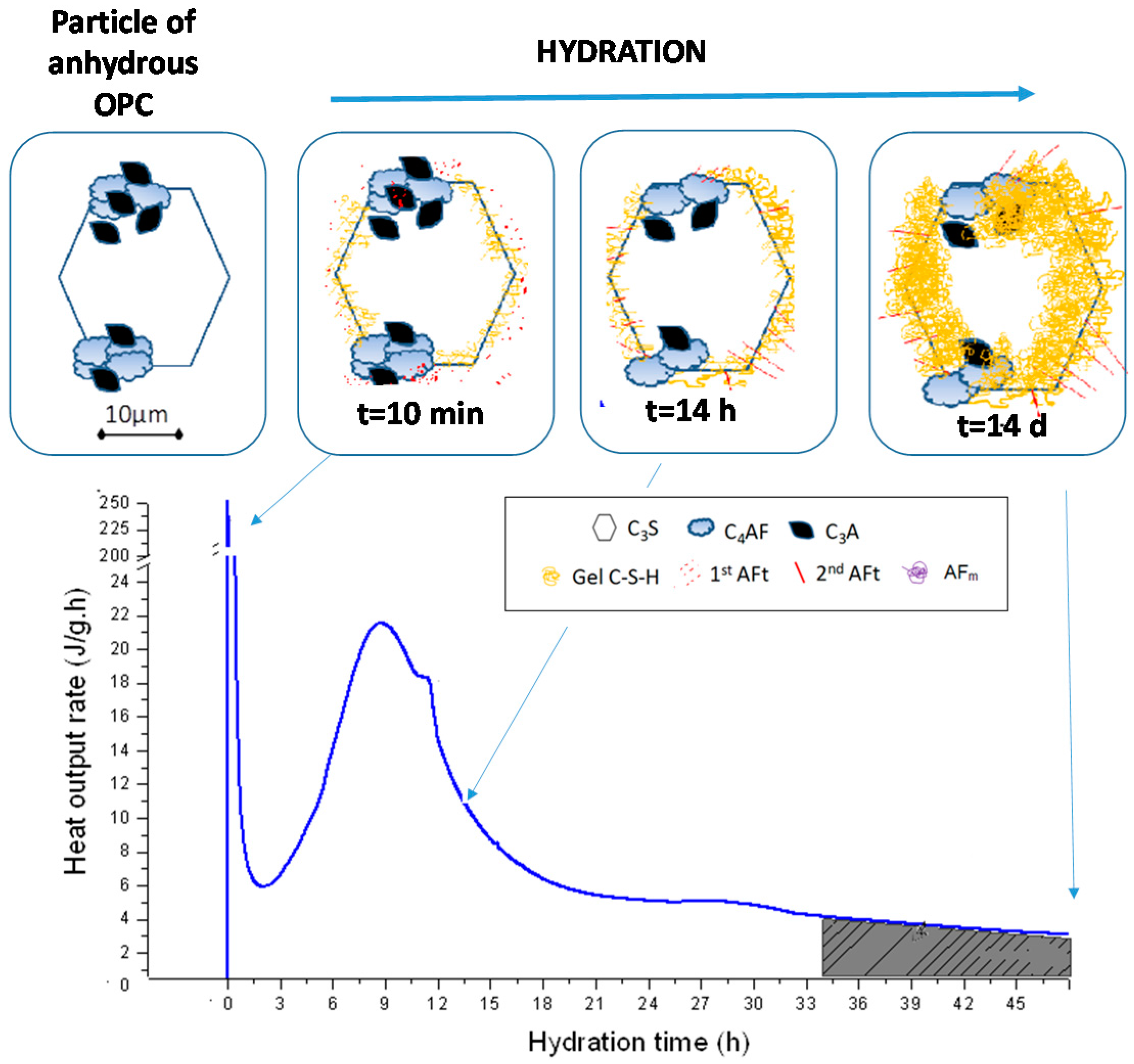 Portland cement clinker consists primarily in four reactive phases: Alite (C3S), belite (C2S), tricalcium aluminate (C3A) and ferrite (C4AF). The most reactive of these components are C3A [35,36] and C3S [37,38,39]. A single grain of cement may be divided into several regions containing different clinker phases. Figure 2 shows a widely accepted descriptive model [40] (first proposed by Scrivener in 1984) [41]. Figure 2, also reproduces a typical calorimetric analysis of OPC hydration for comparison.