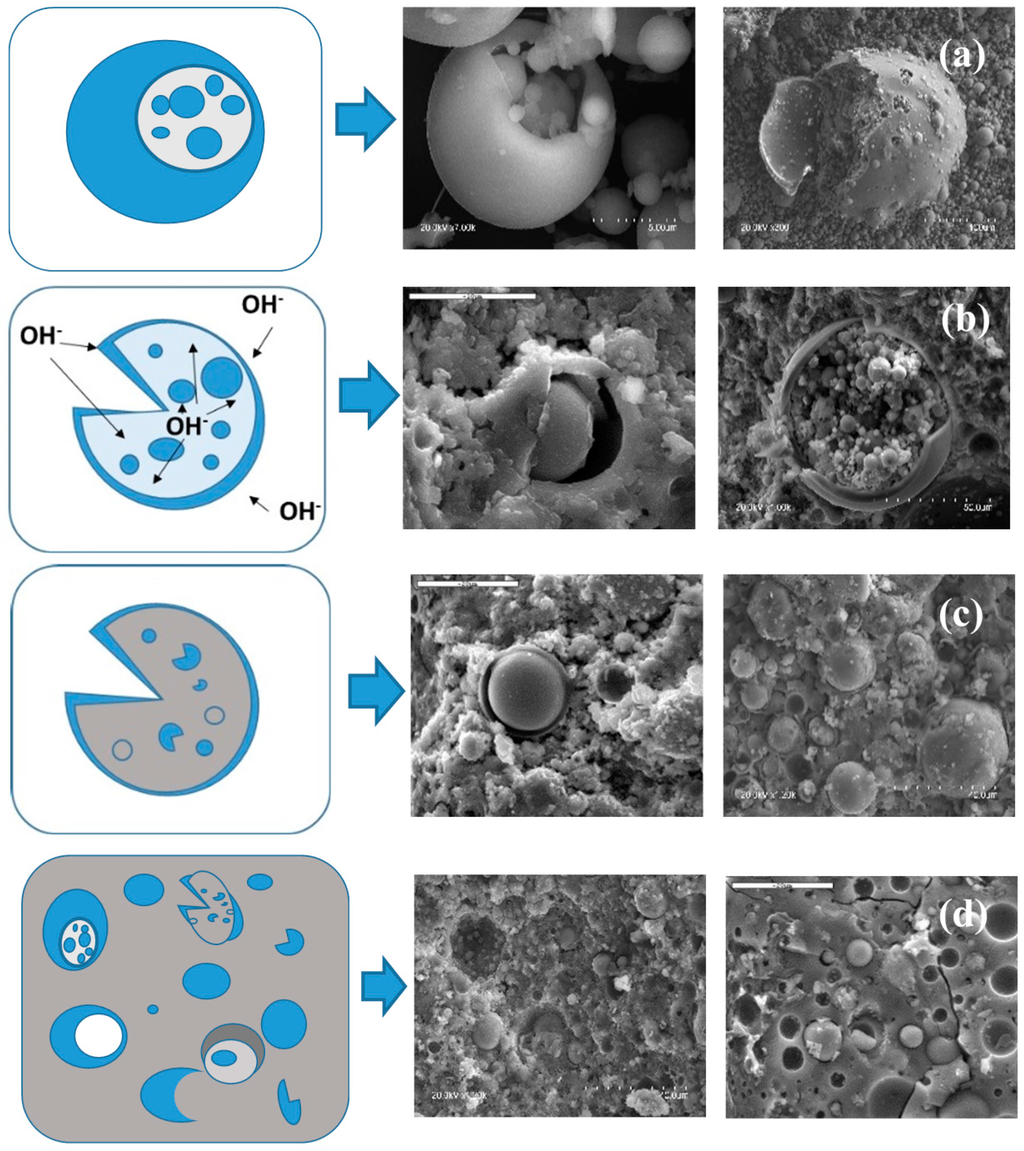 In 2005, Fernández and Palomo [7] proposed a conceptual model for the alkaline activation of fly ash (see Figure 3). The process would begin with a chemical attack on the ash surface, resulting in the formation of small cavities in the walls of the ash particles, exposing the tiny particles on the inside to the action of the alkalis. In this stage of the reaction the alkalis would attack from inside and outside the particles (Figure 3b). The ash would continue to dissolve and the reaction products generated inside and outside the ash crust would precipitate, covering the smaller unreacted spheres and hindering their contact with the alkaline solution (Figure 3c). Alkaline activation would ultimately continue slowly, for once the ash particles are covered by the reaction products, alkaline attack would take place via diffusion only. At the end of the process, a number of morphologies may co-exist in the same paste: Unreacted ash particles, particles under alkaline attack and reaction products (N–A–S–H gel or zeolites). This model is normally applied to the aforementioned ‘cenospheres’ (hollow particles or particles housing smaller spheres), which account for around 30% of the total. All the other particles, which are solid ‘plerospheres’ [51], exhibit greater or lesser reactivity depending on their size. The smallest particles (under one micrometre, approximately 10% of the total) dissolve rapidly in a highly alkaline medium. Despite these rather low percentages, the speedy setting and high early age strength attained with alkaline activation can be largely explained by the intense reactivity of cenospheres and small plerospheres.
