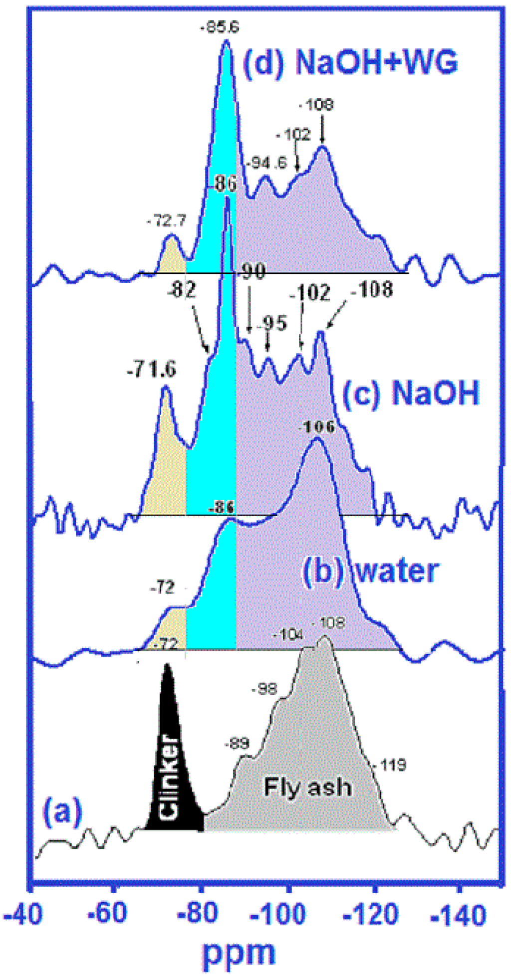 29Si MAS NMR spectra: (a) initial raw mix (30% clinker + 70% fly ash); (b) 28-day water-hydrated material; (c) 28-day NaOH-hydrated material; (d) 28-day NaOH + WG (waterglass)-hydrated material (adapted from Palomo et al. [18]).