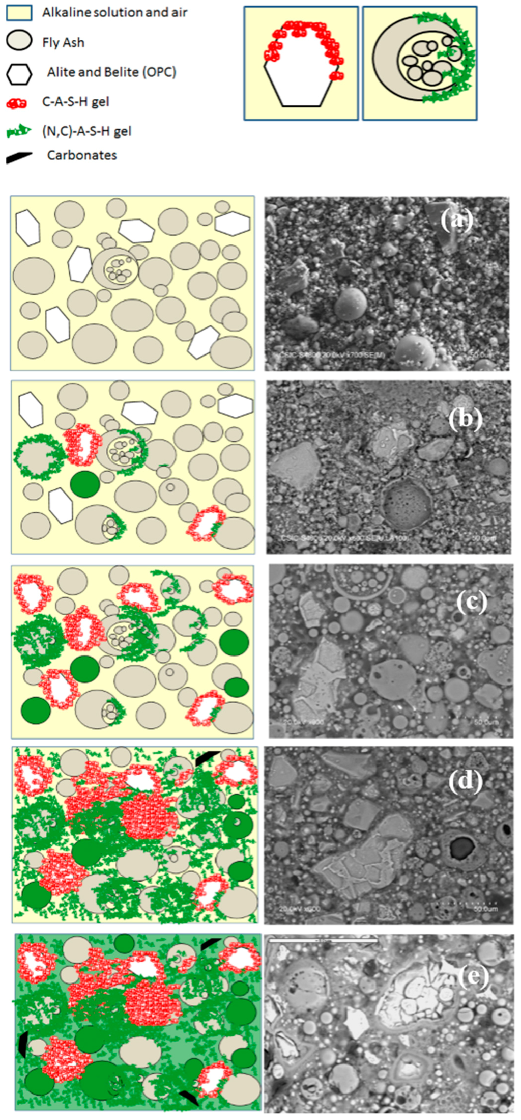 Changes in gel composition and microstructure of a hybrid alkaline cement with a very high fly ash content: (a) initial stage; (b) early age sample (min); (c) early age sample (h); (d) 7-day sample; (e) 28-day sample.