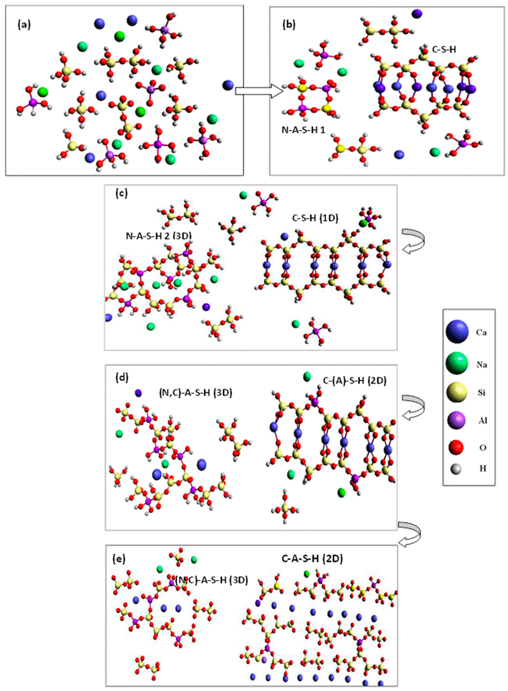 Nano-structural mechanism for gel formation in hybrid alkaline cements; (a) dissolution of ionic species from the source of alumino-and calcium silicates; (b) precipitation of aluminum-high (type I) N–A–S–H gels and C–S–H gels; (c) silica uptake by both gels with an increase in C–S–H gel mean chain length and the generation of silica-high type 2 N–A–S–H gels; (d) diffusion of aluminum and calcium in the matrix and their uptake, respectively, in C–S–H and N–A–S–H gels to form (N,C)–A–S–H gels; (e) distortion of the (N,C)–A–S–H gel due to the polarizing effect of calcium, leading to its rupture, while the C–A–S–H gel continues to take up aluminum species in bridging positions, favoring chain cross-linking and hence a more polymerized structure (hydrogen bonds omitted in this final stage).