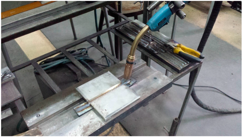 The welding process was done in horizontal position, ISO 6947/2011 [20] position. The preparation of the welding joint with the components and welding gun positioning is presented in Figure 1 and Figure 2, respectively. A butt penetrated weld with access from one side was realized.