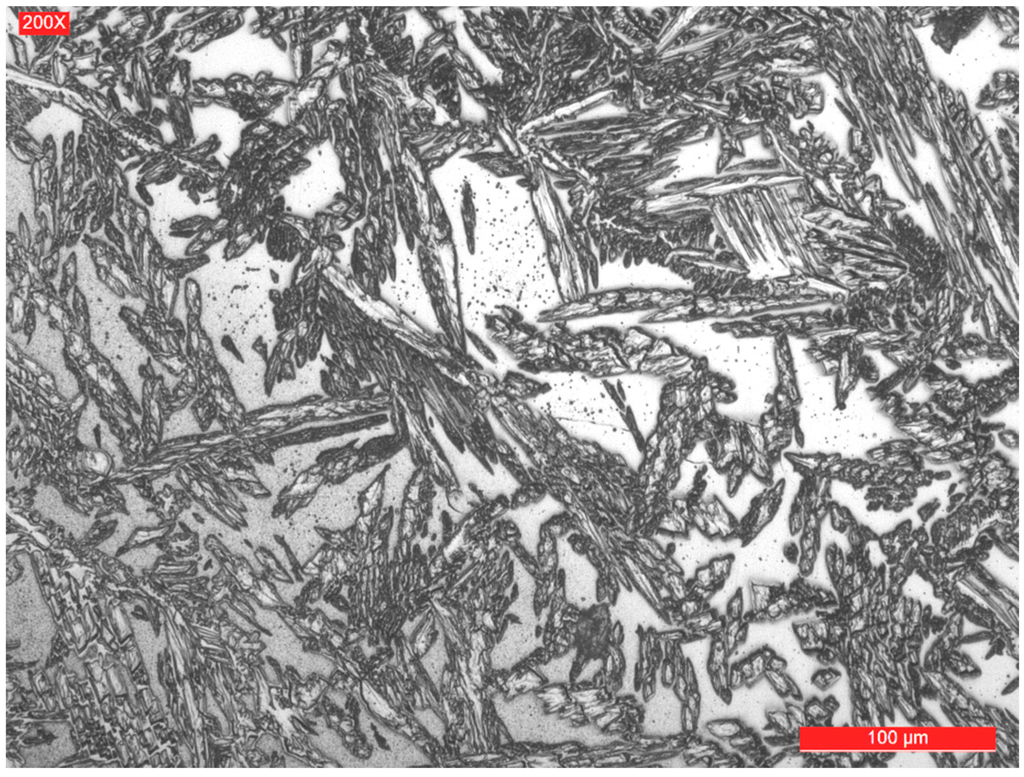 Microstructure of the last deposited layer for achieving the welded joint with a linear energy El = 15 kJ/cm: (a) magnification 50×; and (b) magnification 200×.