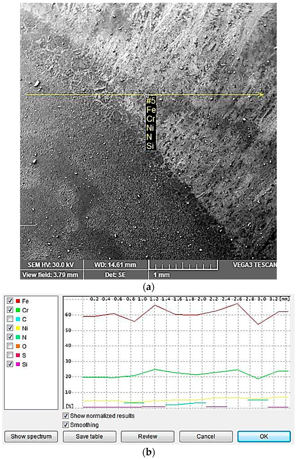 In Table 3 and Figure 10 and Figure 11, the concentration variation of Cr, Ni, Mo is shown in different parts of the welded joints, which have been realized with a linear energy El of 6.9 kJ/cm for the welded joint and of 15 kJ/cm for the filling layers.
