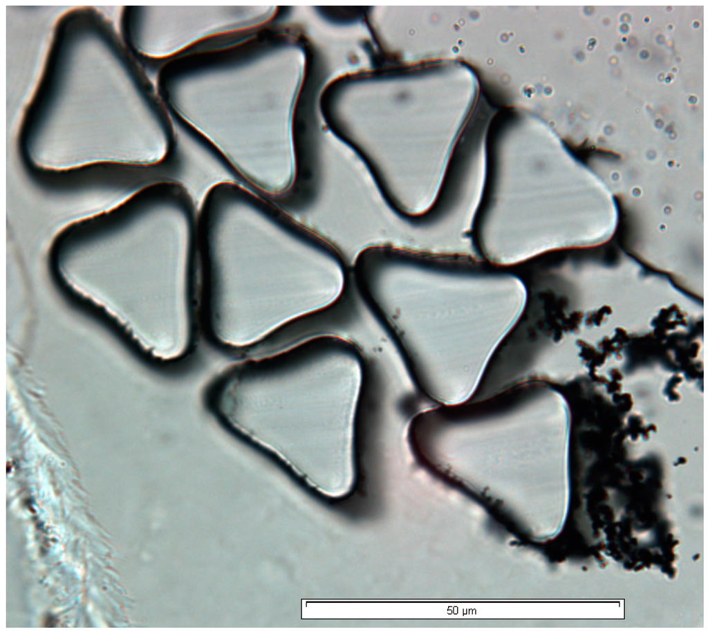 Optical transmission microscopy image of microtome sections of sample fibres of PPy-pTSA coated Nylon-Lycra fabrics, coated for 120 min of polymerisation time.