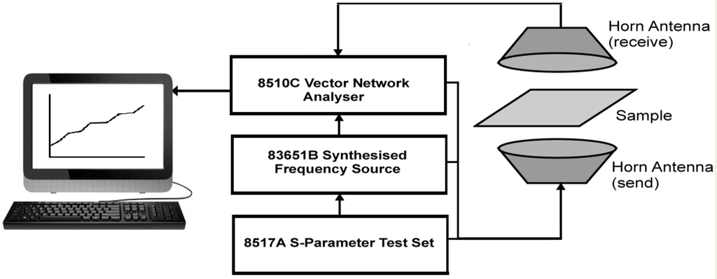 Microwave measurements were carried out by free-space transmission measurement, which is a non-contact free space method that is ideally suited to determine dielectric characteristics for thin, flexible samples such as the conducting polymer coated fabrics. Figure 3 shows a schematic of the free space transmission set-up. The sample is placed flat in the line of radiation between two antennae. A radiation output system then generates a swept signal across a pre-set frequency range and a network analyzer collects the data from the measurement. The transmission and/or reflection of the sample can be determined from the scattering parameters S11 and S21. The S11 and S21 can be converted into magnitude and phase of the reflection, transmission, and the permittivity of the device under test. The relative permittivity of a material consists of a real part (), related to the amount of polarisation, and an imaginary part (), related to dissipation of energy in the material