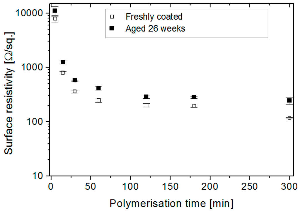 Short polymerisation times resulted in lightly PPy-coated samples with high surface resistivity. The base fabric was white in colour and the light coating produced fabrics light- to medium-gray in tone and with high surface resistivity. Conversely, longer polymerisation times resulted in thicker coatings deep black in colour with considerably lower surface resistivity. The depth of the tone of the coating is a qualitative indication of its surface resistivity. The surface resistivity decreased with the increase in polymerisation time as seen in Figure 4. There was a rapid decrease in the surface resistivity of around 90% with an extension of the polymerisation time from 5 to 15 min. An increase of the polymerisation time from 15 to 30 min resulted in a further 50% drop, and an additional increase from 120 to 180 min caused an approximately 3% drop in the surface resistivity, finally reaching a plateau at high polymerisation times (Figure 4). Samples aged for six months at room temperature (20 °C, 65% RH) displayed a similar trend of increase in surface resistivity with polymerisation time but with 50%–80% higher resistivity across the polymerisation time range.