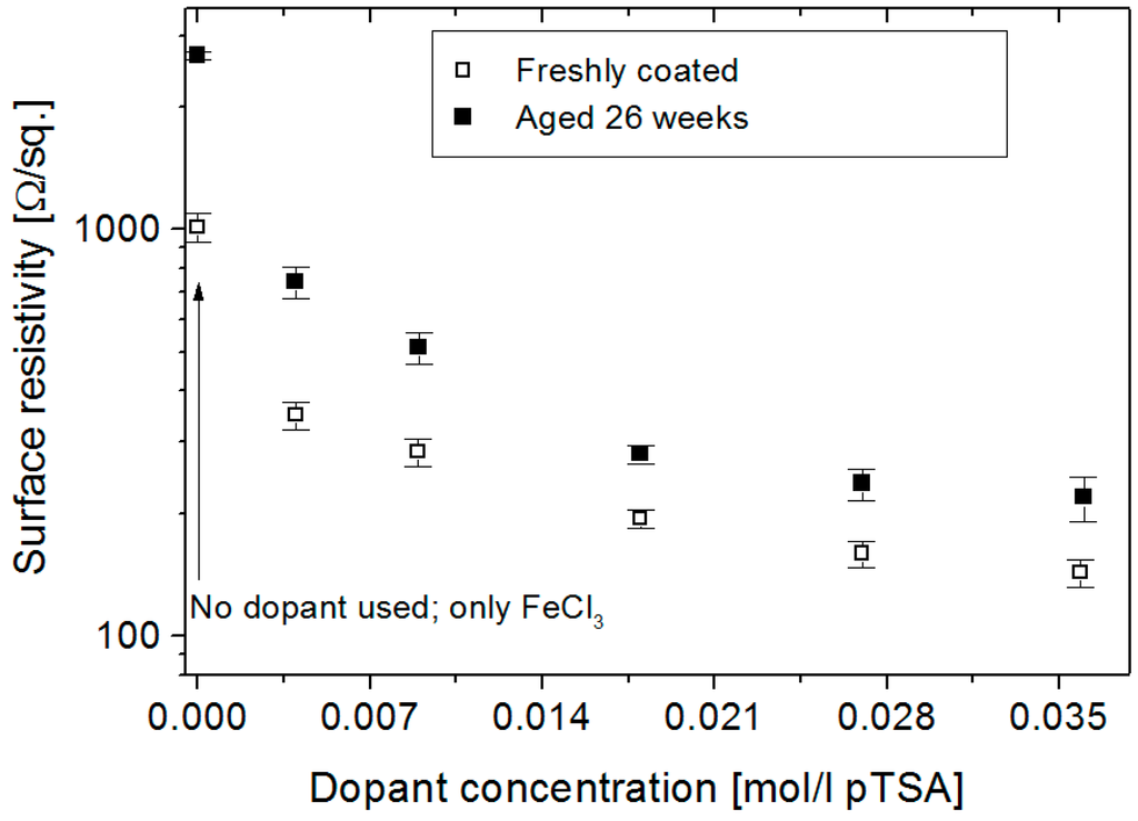 Similarly, the surface resistivity decreased with the increase in the concentration of the dopant, reaching a plateau at high concentrations. Even the addition of small concentrations of the dopant p-toluene sulfonic acid lowered the resistivity up to 70%, as illustrated in Figure 5. Samples aged for six months displayed a surface resistivity increase of approximately 40% for dopant concentrations of 0.018 mol/L and higher, whilst a much higher increase in surface resistivity was seen in lightly doped samples, with low concentrations of pTSA. The increase in surface resistivity upon aging is the largest in the undoped sample (+165%), suggesting that the dopant significantly stabilises the conducting film.