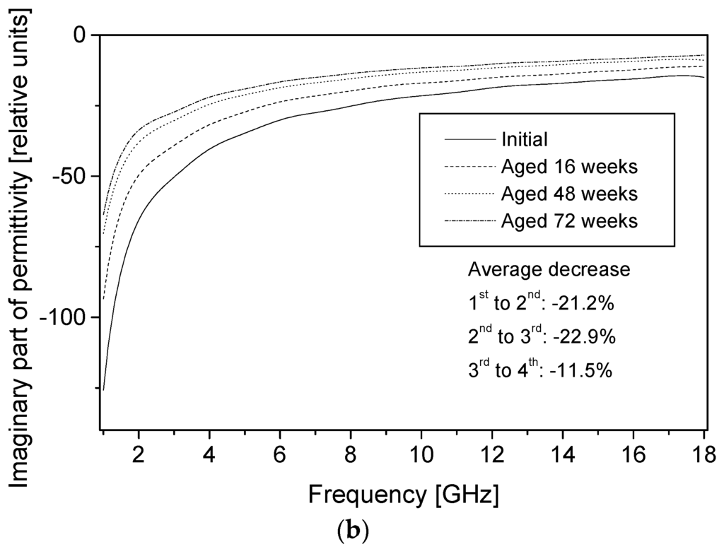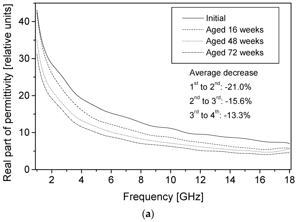 An Agilent Technology 8510C vector network analyzer (Melbourne, Australia) was used to perform the measurements at microwave frequencies. The 8510C analyser was connected to an 8517A S-parameter test set (Keysight, Melbourne, Australia) with an 83651B synthesised frequency source. An IBM compatible computer controls the system, with the software written by Amiet (DSTO, Melbourne, Australia) [12]. The analyzer was calibrated before each measurement. The calibration plane was located at the position of the sample. The calibration was performed without any sample between the two horns, where the transmitted signal corresponds to the total response from the sample and the diffraction. As the free space transmission measurement technique is non-destructive, repeated measurements can be performed on the same sample at set periods of aging. After the initial measurement, readings were taken at 16, 48 and 72 weeks of aging. Changes in the real and imaginary parts of permittivity and reflection, transmission, absorption and total transmission losses during aging are presented and discussed.