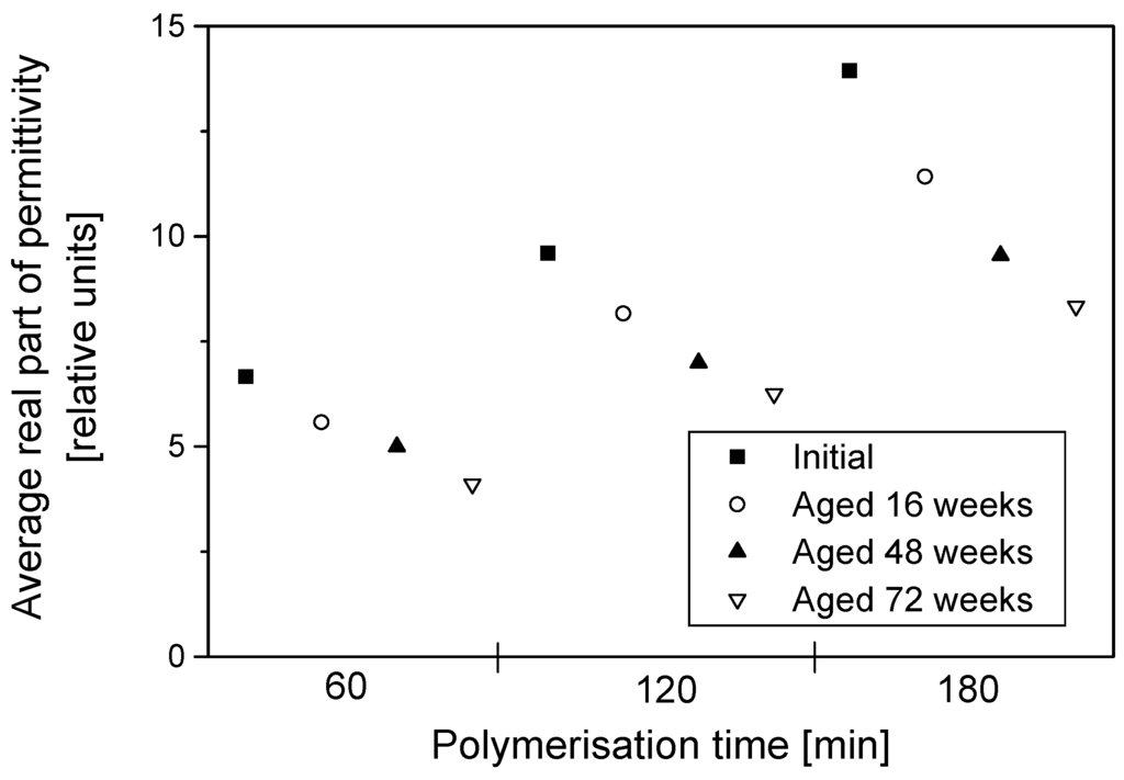 Averages of the real part of permittivity for PPy-pTSA–coated Nylon-Lycra during degradation during aging for three different polymerisation times (60, 120 and 180 min). pTSA concentration: 0.018 mol/L.