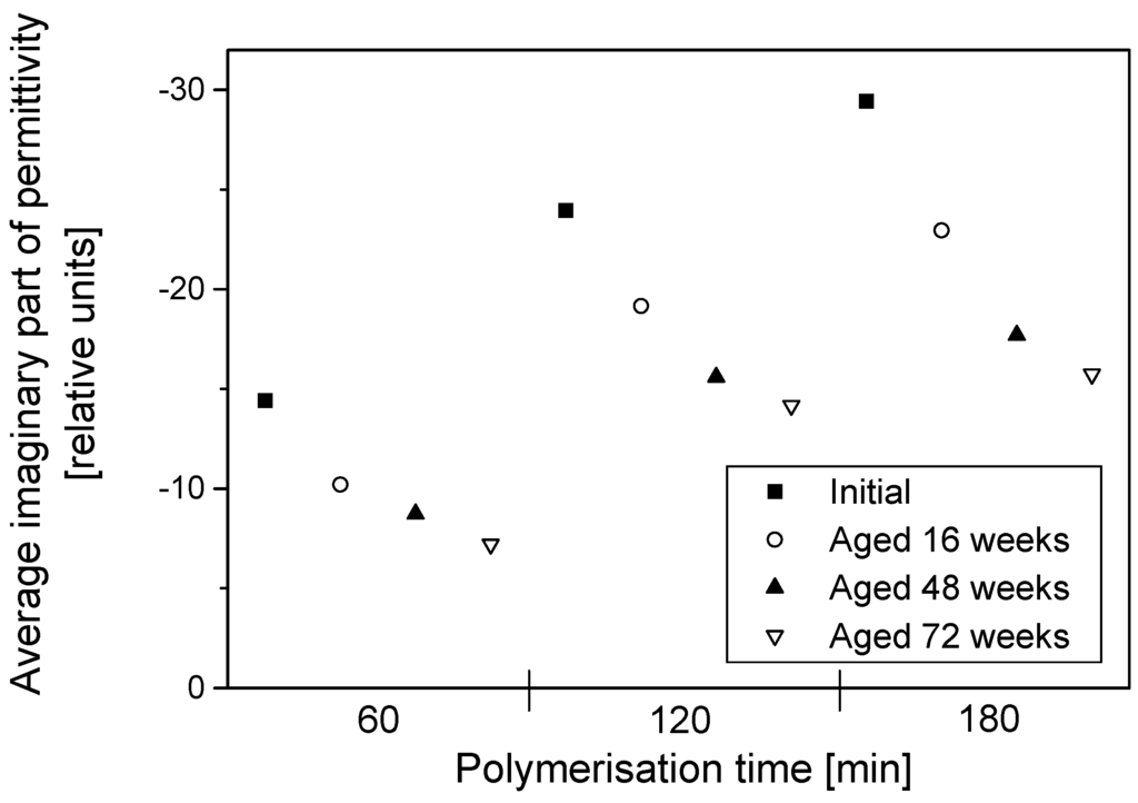 Averages of the imaginary part of permittivity for PPy-pTSA–coated Nylon-Lycra during degradation during aging for three polymerisation times (60, 120 and 180 min). pTSA concentration: 0.018 mol/L.