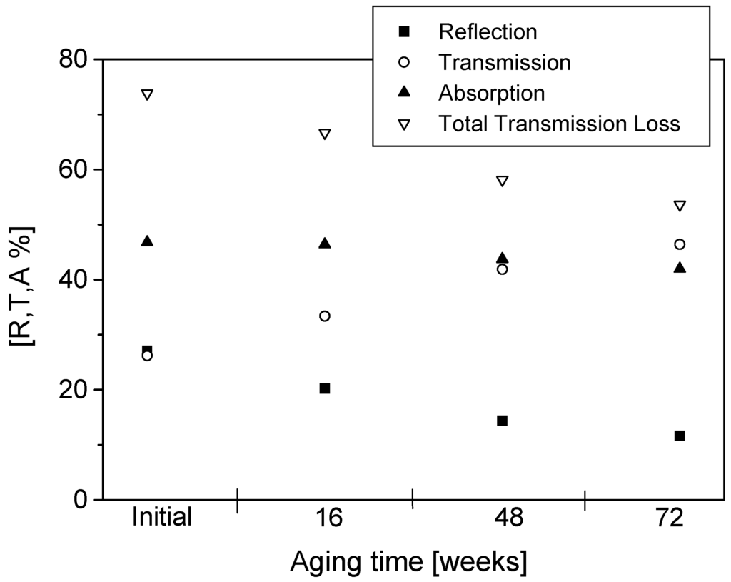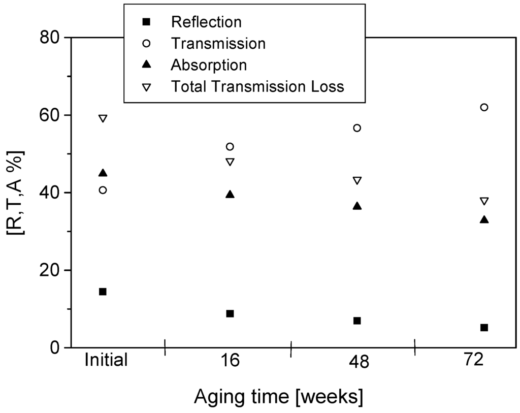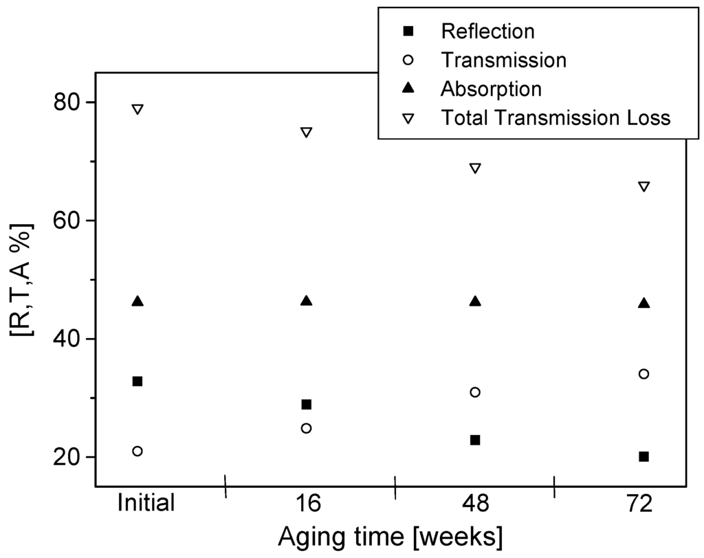 The percentage reflection (R), transmission (T) and absorption (A) as well as total transmission loss initially and after 16, 48 and 72 weeks of aging are presented in Figure 9, Figure 10, Figure 11 and Figure 12. The effects of conducting polymer coating times, dopant concentration and aging can be seen in these figures. In a study of the aging of free-standing PPy films, it was shown that shielding effectiveness reduced up to 60% for lightly doped films after 24 months of aging [14,15,16]. Similar results have been reported for polyaniline [17], displaying a very rapid degradation at early stages of aging, only to slow down at longer aging times.