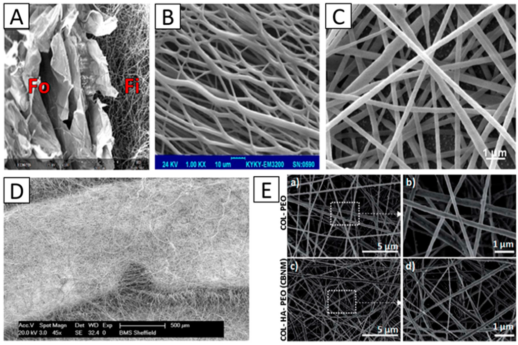Scanning electron micrographs of the scaffolds. (A) Cross-section (foam layer on the left and fibers on the right). Reproduced from [], with permission from © 2014 Tylor and Francis; (B) Oriented nanofibers of silk scaffold. Reproduced from [], with permission from © 2015 Tylor and Francis; (C) Randomly oriented PCL scaffold. Reproduced from [], with permission from © 2014 The Association for Research in Vision and Ophthalmology; (D) A section of the electrospun scaffold showing a horseshoe electrospun micro-pocket. Reproduced from [], with permission from © 2012 Elsevier; (E) Electrospun nanofibrous membranes with binary COL-PEO (a and b) and ternary COL-HA-PEO compositions (c and d). Reproduced from [], with permission from © 2014 The Royal Society of Chemistry.