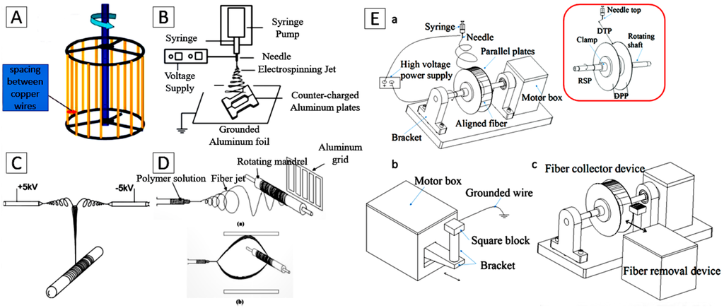 For certain applications in tissue engineering, scaffolds with aligned fibers possess unique electrical, optical, and mechanical properties and are often more desirable to guide cell growth with the desired anisotropy [,,,,]. Several fiber collection methods, including the use of cylinders with high rotational speed [], wire drum collectors (Figure 2A) [,], auxiliary electrode/electrical fields (Figure 2B) [,,], two spinnerets with opposite voltages and directions (Figure 2C) [], frame collectors (Figure 2D) [] and parallel double-thin plate collectors (Figure 2E) [], have been developed to align the fibers on the collector.