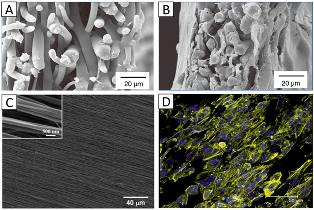 SEM images of randomly aligned PLGA scaffolds: (A) Cross-sectional view of cell-free scaffolds; (B) Cross-sectional view of scaffolds cultured with limbal epithelial cells for 14 days. Panels (A,B) Reproduced from [], With permission from © 2010 Future Medicine; (C) SEM image of aligned fibrous PEUU scaffold. Reproduced from [], with permission from © 2012 Elsevier; (D) Stained human corneal epithelial cells with DAPI (blue, nuclei) and phalloidin (yellow, F-actin) after three days of culturing on the aligned PGS/PCL nanofibrous scaffolds. Reproduced from [], with permission from © 2014, The Royal Society of Chemistry.