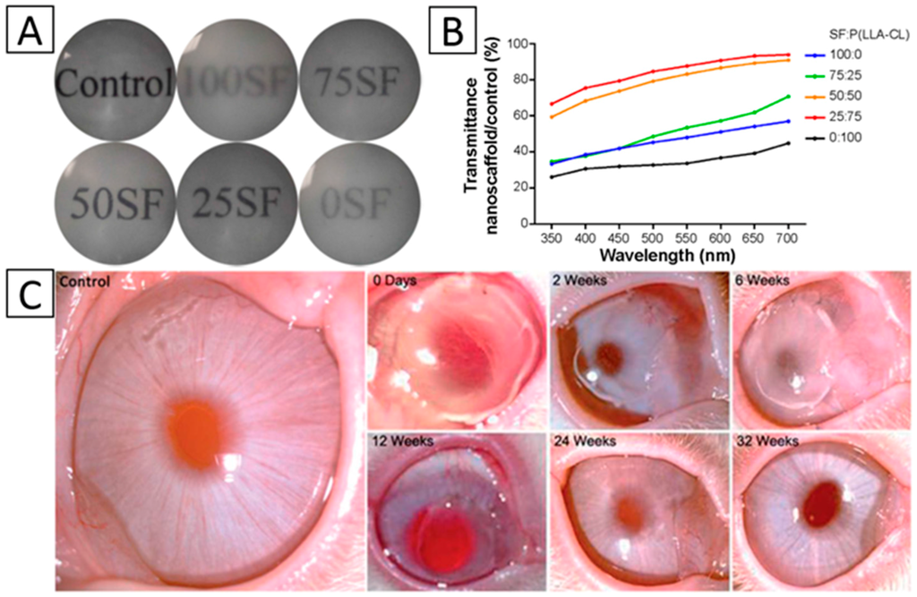 Transmission of light in nanofibrous membranes. (A) General transmission of light with different blend ratios; (B) Accurate transmission percentage compared with the control group of A. Panels (A,B), Reproduced from [], with permission from © 2015 Chen et al; (C) Restorative process of the corneal transparency of NZWRs during a 32-week post-operative slit-lamp examination. Reproduced from [], with permission from © 2015 The Royal Society of Chemistry.