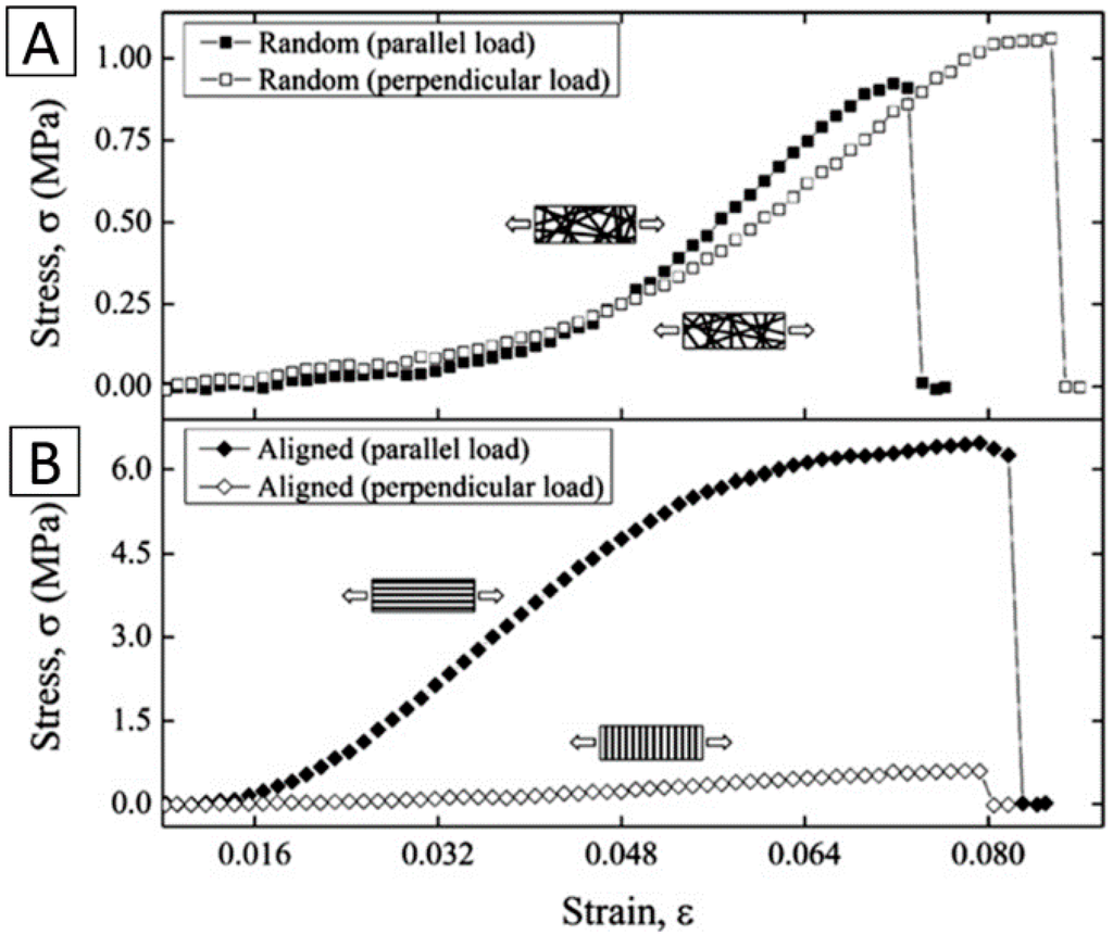 A comparison of stress-strain curves of (A) randomly oriented and (B) aligned electrospun gelatin mats under two different loading orientations. Reproduced from [], with permission from © 2013 Elsevier.