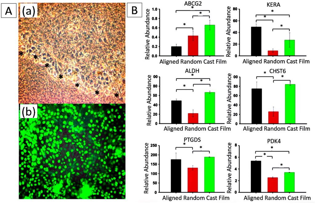 (A) Biocompatibility assessment of electrospun PCL nanofibers. (a) Phase contrast picture shows migration of human corneal epithelial cells over nanofibers (black stars line); (b) Epithelial cell sheet demonstrates high viability ratio of human corneal epithelial cells on nanofibers by their positive green staining. Cells were observed at 200× magnification. Reproduced from [], with permission from © 2011 Molecular Vision; (B) Changes in gene expression of hCSSCs seeded on aligned fibrous substrates (black), random fibrous substrates (red) and cast films (green). mRNA abundance was compared with hCSSCs cultured in SCGM. Ratios of abundance of each transcript between hCSSCs seeded on different substrates cultured in keratocyte differentiation medium and in SCGM are expressed on a linear scale. Since KERA has no expression in hCSSCs cultured in SCGM, it is expressed in an absolute manner. Error bars show the SD of three independent samples. For each gene, expression levels were significantly different between the studied substrates (p < 0.05), except for CHST6 and PTGDS on aligned fibrous substrate and cast film. Reproduced from [], with permission from © 2012 Elsevier.
