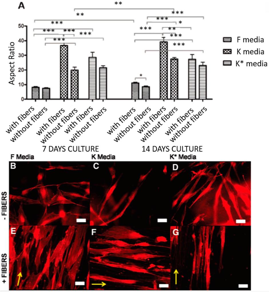 (A) Average aspect ratio for human-derived corneal stromal cells seeded in the hydrogel constructs with and without the inclusion of nanofibrous meshes cultured under F, K and K * media for seven and 14 days. * p ≤ 0.05, ** p ≤ 0.01, *** p ≤ 0.001. (B–G) are representative actin-stained cells of collagen hydrogel constructs with (E–G) and without (B–D) the incorporation of nanofibrous meshes following 14 days in culture in F, K and K * media, respectively. When cultured in fiber-free constructs, cells grown in serum-containing F media had a shorter, fusiform morphology (B) compared to the more elongated morphology of cells cultured in serum-free K and K * media (C,D). The addition of nanofibers increased organization within the constructs and encouraged all cells to align and adopt a more elongated morphology (E–G). Yellow arrows indicate the direction of fibers, scale bar = 50 μm. Reproduced from [], with permission from © 2012 WILEY-VCH Verlag GmbH and Co. KGaA, Weinheim.