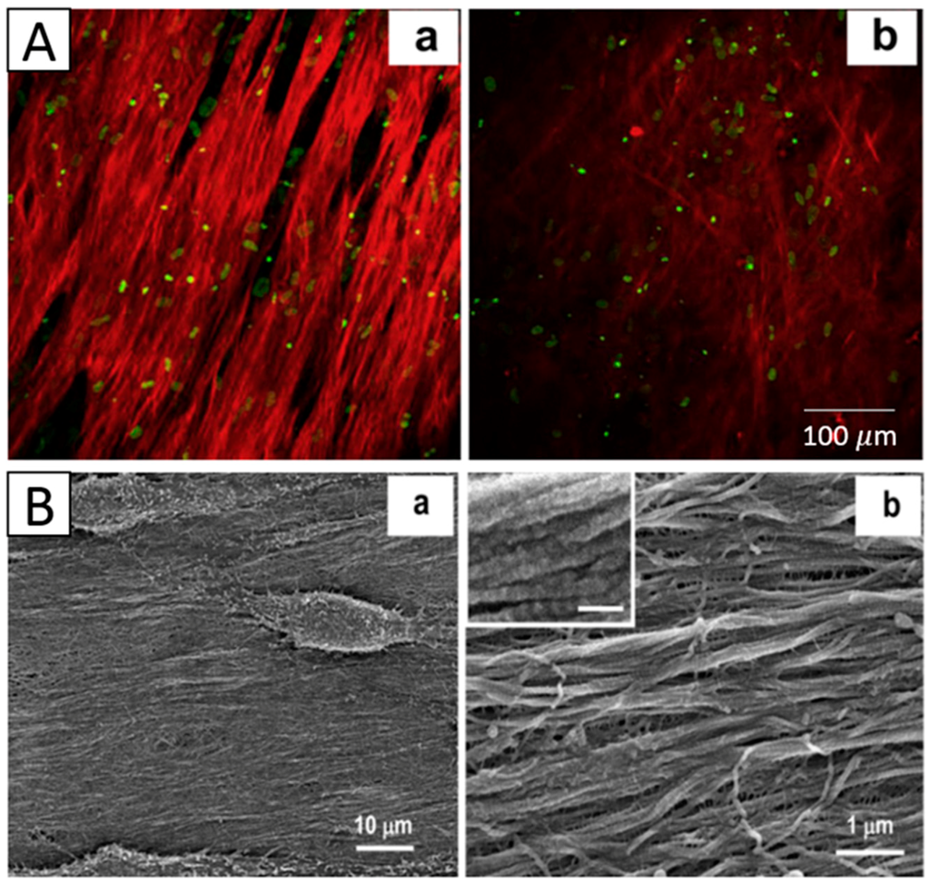 (A) Two-photon images of hCSSCs-secreted ECM varying with: (a) aligned fibrous, (b) random fibrous PEUU mat and (B) SEMs of hCSSCs and the elaborated ECM on the (a,b) aligned fibrous. Reproduced from [], with permission from © 2012 Elsevier.