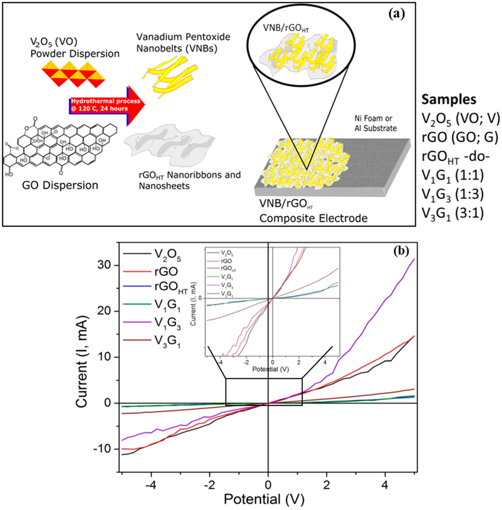 (a) Schematic of the composite electrodes comprised of vanadium pentoxide (VO) nanobelts (VNBs) and rGO nanosheets/nanoribbons in different composition ratios using hydrothermal synthesis technique; (b) room temperature I–V electrical properties showing quasi-linear (or non-ohmic) behavior.