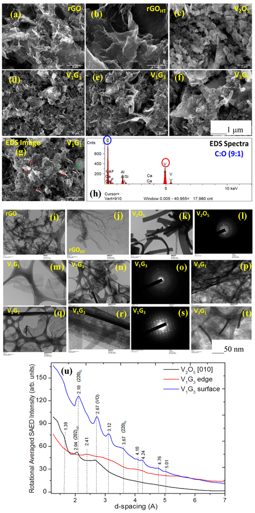 (a–g) SEM micrographs; (h) EDS spectra; TEM micrographs of (i) rGO; (j) rGOHT; (k) V2O5; (m,q) V1G1; (n,r) V1G3; (p,t) V3G1; (l,o,s) SAED and (u) the real space (dhkil) intensity pattern revealing the crystal structure of ‘hybrids’ for the representative samples studied. The surface morphology and semicrystalline nature of VNBs with rGOHT nanosheets is apparent (scale bars are shown at the bottom of the images).