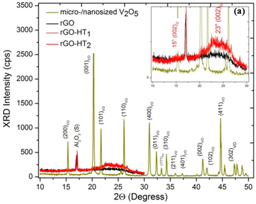 All of the samples were characterized in terms of surface morphology and microstructure, crystal structure and electrochemical properties. Scanning electron microscopy (SEM) images were taken with an instrument (Model JEOL 6010Plus, Peabody, MA, USA) operating at primary electron acceleration voltage (Vacc) of 10 kV and a constant current of 45 μA in secondary electron imaging (SEI) mode collected with an in-lens detector equipped with an X-ray ISIS EDS system providing surface morphology. Samples for TEM (transmission electron microscopy) and SAED (selected area electron diffraction) were prepared by placing one to two drops of individual component and of hybrids on commercial lacey carbon-coated Cu mesh grids (Ted Pella Inc., Redding, CA, USA) and allowed to air dry. They were taken using a JEOL instrument (JEOL Model 1400 Plus, Peabody, MA, USA) operating in cryo-EM and SAED modes at 200 kV or 100 kV and 1 nA with a Be specimen holder, a Gresham SiLi detector with a Moxtek AP3.3 window. For SAED patterns, we used a 0.20-μm aperture, producing a small spot size, and spread the beam to increase the electron coherence length at the samples. TEM and SAED measurements provided intrinsic microstructure and nanoscale morphology and determined interplanar spacing. X-ray diffraction (XRD) patterns were obtained with the Siemens Model D5000 instrument (now Thermo Scientific, Waltham, MA, USA) in Bragg–Brentano θ-2θ geometry ranging 2θ from 8° to 60° using a Cu Kα X-ray source (λ = 1.5405 Å) operating at a voltage of 45 kV and a current of 40 mA. Samples were run at a scan rate of 0.04°/s or to improve the signal-to-noise ratio; a scan rate of 0.02°/s was used. Raman spectra were measured to determine the lattice vibration at various regions of interest on the samples. The spectra were recorded using a micro-Raman spectrometer (Model InVia Renishaw plc, Gloucestershire, UK) equipped with a laser providing an excitation wavelength of 633 nm (EL = 1.92 eV) and an ~4–6-mW power incident on the sample, with the edge filter cutting at ~100 cm−1. The scattered light from the sample is collected in backscattering geometry transmitted by a beam splitter and detected by a CCD camera. The reflected light is filtered using an edge filter to remove the laser excitation and sent to a spectrometer. An objective lens of 50× was used providing a spot size of ~1–2 μm, and extreme care was taken to avoid sample damage or laser-induced thermal degradation. Either 5% or 10% light intensity was used to accurately obtain spectra while avoiding thermal degradation. Spectra were acquired at time intervals of 30–60 s, although increased to a few minutes to maximize signal throughput. The Raman shift ranged from 150 to 3200 cm−1 for hybrid composites with a spectral resolution of 1 cm−1. Allowing more details and understanding the interaction between rGOHT and VNB, we measured room temperature electrical (I–V) properties’ in-plane configurations. We made electrical contacts with colloidal silver paste and attached a Cu wire for connection with the Keithley 2400 source meter (Keithley, Cleveland, OH, USA). We measured in-plane two-point contact resistance and determined room temperature electrical conductivity (σdc) for all of the samples studied. The hybrids apparently displayed semiconducting (i.e., non-ohmic or nonlinear) behavior, as anticipated. Quantitatively, the electrical conductivity measured for these hybrids ranged from 0.01 to 2.1 s/cm (see Figure 1b).