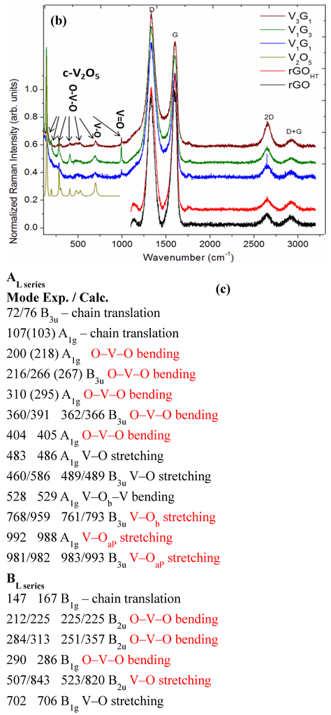 (a) X-ray diffractograms displaying characteristic peaks for graphene (002) and VNBs along with the substrate (Al2O3). The narrow peaks exhibit higher crystallinity and their position is indicative of primarily the α-V2O5 phase; (b) Micro-Raman spectra showing peaks associated with rGO and V2O5. The characteristic D, G, 2D and D + G combination bands are apparent along with V2O5 nanobelts for composites; (c) Experimental and calculated Raman spectral bands for the V2O5 lattice are also tabulated with group symmetry.
