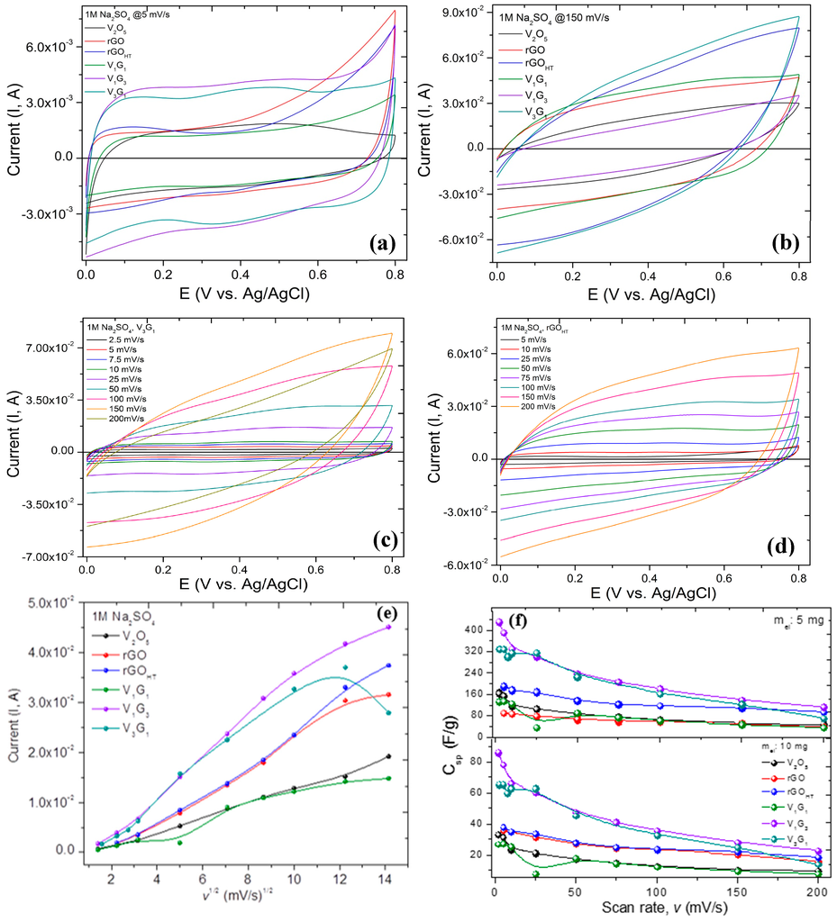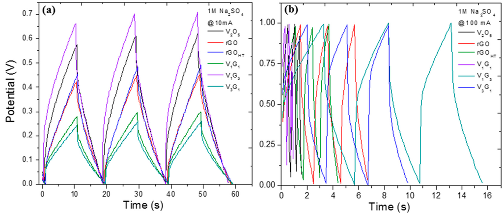 Figure 4a–d shows cyclic voltammograms for all of the GVNB composites at scan rates of 5 and 150 mV/s and V3G1 and rGOHT with scan rates ranging from 2.5 to 200 mV/s, in 1 M Na2SO4 electrolyte. The CV curves show a quasi-rectangular behavior, confirming the double-layer capacitance of these composite electrodes. The vanadium-rich composite (V3G1) shows broader redox peaks with retention of the quasi-rectangular shape in the potential window of 0.0–+0.8 V. The CV from graphene derivatives are in stark contrast to the hybrids, which are nearly rectangular loops, indicative of almost an ideal supercapacitor. Specifically, all hybrid electrodes displayed well-defined pseudocapacitive behavior at a scan rate of 5 mV/s with two redox peaks at +0.18/+0.3 V (cathodic I/anodic II) and +0.45/+0.5 V (cathodic III/anodic IV) related to presumably faradaic (redox) reactions relating to the conversion between different vanadium oxidation states. Moreover, the VNBs have a layered crystal structure and multivalent oxidation states of vanadium ions. These properties facilitate the insertion and extraction of alkali-metal electrolyte ions (Li+, Na+, K+, etc.) in the vicinity of the electroactive material. The electrochemical sodium-ion insertion process can be expressed as follows [,]: . From the equation, the charging-discharging processes involve reversible intercalation of Na+ into layered VNBs with simultaneous electron transfer, i.e., the partial reduction of V5+ to V4+ (and vice versa during oxidation), and thus, provides pseudocapacitance to VxGy composites. Figure 4e shows the variation of the maximum current with the square root of the scan rate (v1/2), and the quasi-linear behavior, especially at higher scan rates, is reminiscence of diffusion-limited (mass transport) phenomena and reflective of heterogeneous diffusion attributed to the composite nature of hybrid electrodes. The magnitude of the current observed is governed by the Randles–Ševćik equation for a reversible transfer process, or , alternatively, representative of either a multielectron quasi-reversible (most likely for our hybrids) or a case of a fully-irreversible electron transfer process following: (or ), where A is the geometric area of the electrode (cm2), α is the transfer coefficient (usually presumed to be close to 0.5), F is the Faraday constant (C·mol−1), D is the diffusion coefficient (cm2/s), C is the concentration (mol/cm3), v is the scan rate (V/s), R and T are the usual constants, n (=1) is the total number of electrons transferred in the electrochemical process and n′ (=0.6) is the number of electrons transferred before the rate determining step. The analysis of the current helped to determine the D coefficient that ranged between 2 × 10−9 and 8 × 10−9 m2·s−1 for all of the samples studied. The larger integrated area CV curves for hybrids implies that they have higher specific capacitance (Cs), as discussed below. The specific gravimetric capacitance (Cs) of the hybrid electrodes is calculated according to the following equation: , where m is the mass of the active electrode material (g) measured using a micro-balance. Figure 4f presents variation in Cs with the scan rate for all of the electrodes that show a gradual decrease in Cs with the scan rate peaking at a scan rate of 5 mV·s−1, being 450, 350 and 180 F·g−1 for V1G3, V3G1 and rGOHT, respectively, as an upper bound, considering that the average mass of the electrode material is 5 mg. We also measured charging-discharging (V–t) profiles shown in Figure 5 and determined gravimetric capacitance following: , where I is the applied discharge current, Δt is the discharge time after IR drop, ΔV is the discharge potential window after IR drop and m is the mass of the single electrode material, respectively. The factor of 2 is used because series capacitance is formed in a two-electrode cell system. The V–t profiles between 0 and 1.0 V at different current densities and cyclability of various electrodes exhibits stable performance for more than 500 cycles, and the fading in Cs is possibly due to internal resistance and polarization of the electrodes. The Cs values are comparable at a specific current density 10 A·g−1 to those determined using CV curves. Moreover, Cs of the hybrid electrodes was significantly larger than that of rGO-only electrodes with values of ~60–70 F·g−1. Generally, the rate capability is strongly influenced by ion diffusion in the electrolyte, the surface adsorption of ions on the electrode materials (electrode/electrolyte accessibility) and the charge transfer in or on the electrode. At higher scan rates, any of these three processes is relatively slower, which limits the rate, lowering the Cs. Nevertheless, the higher specific capacitance is attributed to smaller size vanadium pentoxides nanobelts, resulting in high specific capacitance. Although GNS have a supplementary (supercapacitive) contribution to the hybrid composites, they have excellent electronic conductivity and, thus, shuttle the electrons between vanadium-oxide nanostructures and the current collector. Therefore, the chemical integration between rGOHT-vanadium pentoxide nanobelts (VNB) into a single system enhanced the electrochemical behavior of pseudocapacitive electrodes. The synergistic effects of chemical bridging (utilizing electrostatic and coordination interactions between negatively-charged surface functional groups of (rGO) and V4+/V5+ ions), the crumpled and flower-like surface morphology promoted tailored properties and interfaces and topologically interconnected network architectures [,,]. We attribute this enhancement to the concomitant double-layer or non-Faradaic capacitance and pseudocapacitive (redox) electrochemical processes on the addition of rGO with VNBs (VmGn) composite materials. Following the reaction equation, the charging-discharging processes involve reversible intercalation of Na+ into layered VNBs with simulta