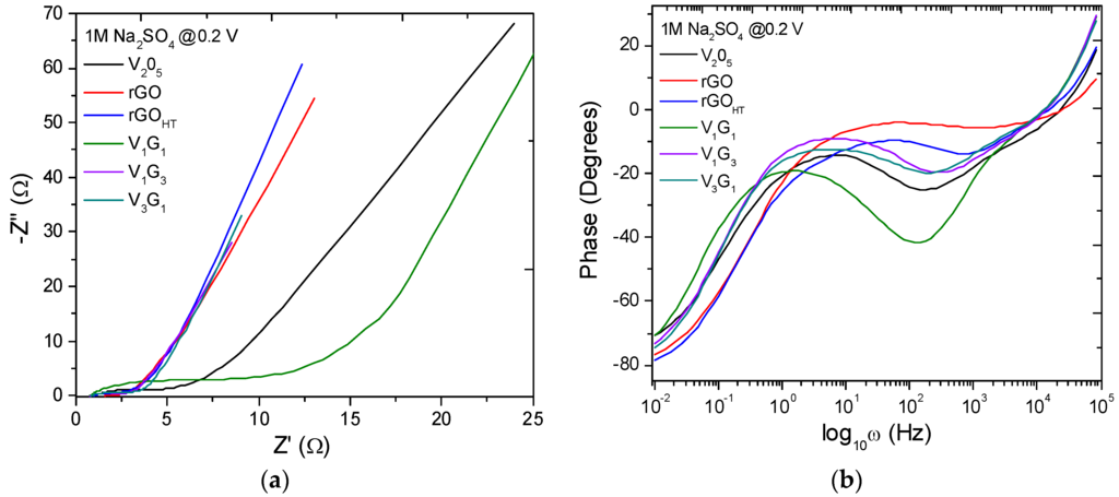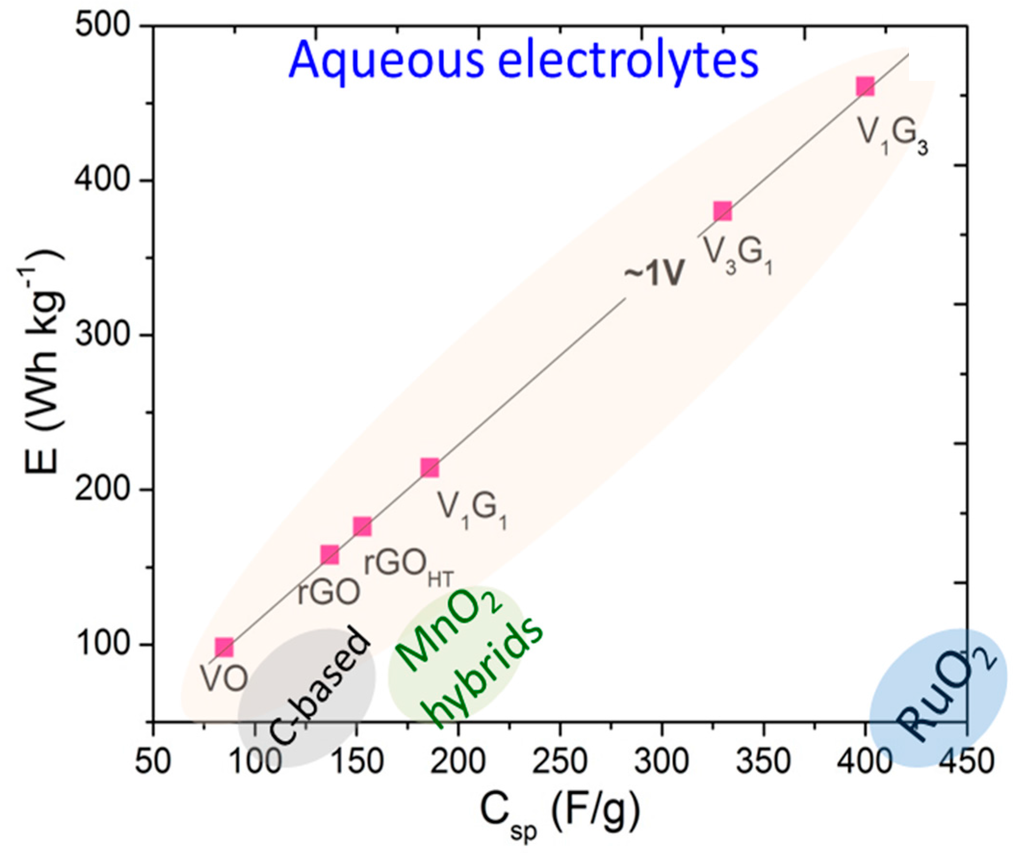 In summary, a series of graphene nanosheets/vanadium pentoxide nanobelt hybrids with different weight ratios was prepared by a facile hydrothermal decomposition method. We systematically performed microscopic structural and electrochemical properties/performance studies. The dimensionality of graphene nanosheets combined with vanadium pentoxides creating tailored interfaces with tunable properties plays a significant role and is a key factor in determining the response of these materials towards electrochemical (re)activity. The electrochemical properties showed higher specific capacitance for graphene-rich composites with optimized VO loading as compared to VO-rich ones and the constituents, and this decreased with increasing scan rate, as anticipated. We attribute this to the fact that the nanostructured VO is involved in the faradaic reaction (pseudocapacitance) coupled with highly conducting rGOHT having a large surface area, implying supercapacitive behavior, which can be practically used to deliver high power and energy density along the Ragone plot metrics. The three-dimensional multiplexed and highly conductive pathways provided by the rGOHT scaffold architectural support also ensure rapid charge transfer and conduction due to the larger accessible geometric surface area. We simulated ac impedance spectroscopy data with conventional and CPE circuit models, which was useful in determining various equivalent circuit parameters. We attribute the overall good performance due to the synergistic effects from supercapacitive graphene as an elastic and electrically-conductive matrix and pseudocapacitive VNBs, allowing faster ion transport across the electrolyte.