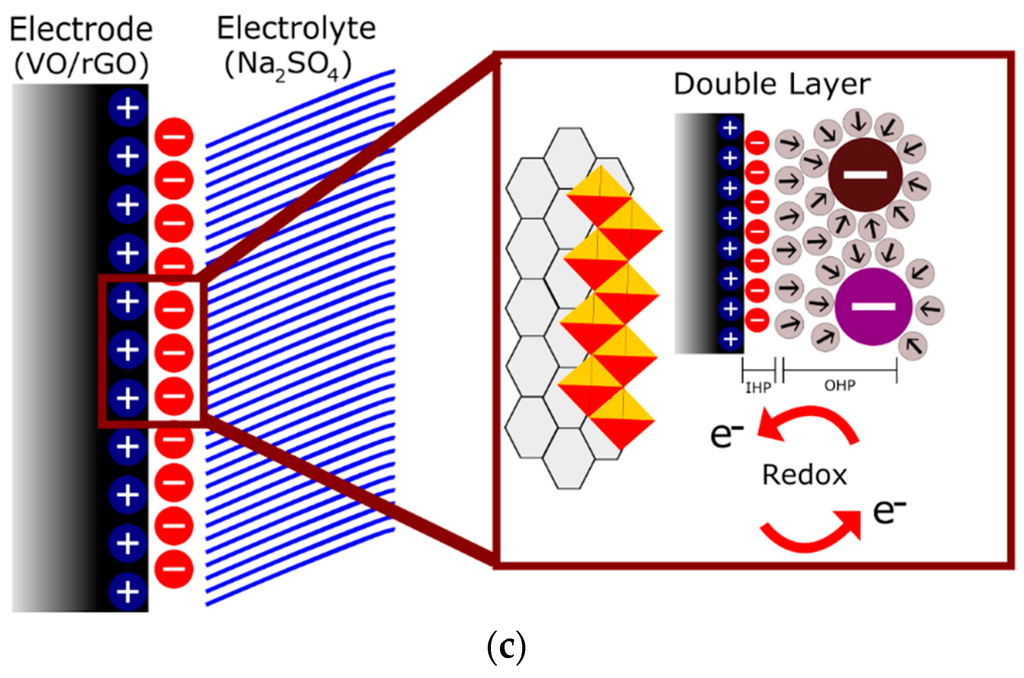 Density functional theory (DFT) ab initio calculations help to elucidate the fundamental properties at graphene-metal oxide and graphene oxide-metal oxide interfaces, particularly in terms of lattice stability, electronic structure (electron density of states (DOS)) [] and interfacial/surface charge transfer. Schematic diagrams for the clean graphene support, clusters of adatoms VO2 and V2O5 on the graphene sheet (top view, right panels of Figure 9) alongside comparative total and partial DOS spectra of the VO2/graphene and V2O5/graphene (the most stable structure) are shown in Figure 9a–c, quantifying unoccupied and occupied states. From the electronic DOS behavior, the hybrids exhibit semi-metallic behavior, i.e., finite DOS energy levels within the Fermi level, making a considerable contribution to the total DOS at EF, and this behavior changes marginally with different graphene-vanadium oxide (VO2 and V2O5) interfaces, contributing toward enhanced electroactive sites. The partial DOS calculations also show that the electron contributions of V d states prevail and the other contributions of the 2s and 2p oxygen states. Table 4 provides the summary of the adsorbate orbitals per atom and the surface charge transfer (alternatively, doping type) between the adsorbate and the graphene support []. More specifically, adsorption of VO2 on graphene causes charge transfers from the adsorbates to the substrate of 0.1 e and 0.19 e, respectively. The exact opposite is observed for V2O5 on graphene. For VO2 and V2O5 on graphene, some charge from the vanadium 4s orbital is transferred to the empty 4p orbital. Additionally, for V2O5 (the vanadium average charge is 21.6 e), we have four oxygens with a charge of about 8.5 e, whereas the fifth oxygen has a charge of about 9 e. On the contrary, for VO2 (vanadium average charge is 21.8 e), the charge for oxygens is about 8.5 e. This implies that the fifth oxygen in V2O5 is pulling electrons from the substrate. This is consistent with the statement that the graphene conductivity is never smaller than the minimum value of the quantum conductivity limit. Thus, it is possible to suppose that graphene can retain its unique properties in graphene/VxOy systems similar to other transition metal oxide-graphene interfaces [,,]. Moreover, it is noteworthy that higher performance originates not only from the Gr/VO interactions, but also arises from the dimensional tuning of VxOy at the nanoscale. It is conceivable that nanostructures and the thin layer being accessible to the electrolyte result in the maximum utilization of the metal oxides (i.e., minimization of dead volume).