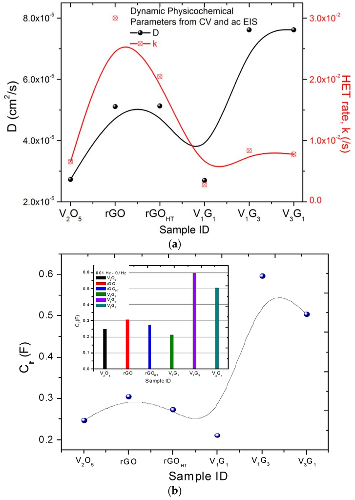 In order to further understand the reasons behind the unique performance of hybrid electrodes, electrochemical impedance spectroscopy (EIS) data were analyzed to investigate electrode kinetics and to quantify electronic and ionic contributions besides determining various circuit elements in bulk electrolyte and at the electrode/electrolyte interface. Nyquist plots (−Z″ versus Z′) are shown in Figure 6a for representative hybrids besides the phase response with semilog frequency in Figure 6b. The impedance plots exhibit good supercapacitor behavior with a straight sloping line (i.e., solid-state diffusion in bulk electrolyte and OH– ion diffusion or electron transport into the electrode) in the low-frequency (interfacial) region and a small semicircle arc (i.e., solid-electrolyte interphase and grain boundary) in the high-frequency region (see Figure 6c for the electrode/electrolyte interfacial schematic). Furthermore, the phase change of almost 70°–80° indicates the capacitive behavior of the hybrids. The impedance data were simulated to fit the experimental data using in-built “sim” software with our electrochemical workstation with different equivalent circuit models and to extract useful circuit parameters. Figure 6a,b insets show proposed equivalent circuit models, and the simulated results are summarized in Table 2 and Table 3, respectively. The models consist of (1) Rs, equivalent series resistance (ESR), which includes ionic or bulk resistance of the electrolyte solution combined with interface resistance, intrinsic and contact resistance at the electroactive material/current collector [], Rct, charge transfer resistance, ZW, Warburg impedance, Cdl, double layer capacitance, as in Randles’ equivalent circuit; and (2) the constant phase element (CPE) equivalent circuit [,,]. The CPE circuit includes an inductor (Ls) to account for self-inductance of the wire leads, a capacitive element (Ce), solution (Rs) and charge transfer resistance (Rct), Warburg impedance (ZW) and CPE (Q0, n), replacing the capacitor used to characterize double-layer capacitance (Cdl) in Randles’ circuit. By definition [], 1/ZCPE = Yo = Qo (ω)n e-iπn/2; Qo = 1/|Z| at ω = 1 rad/s, n = 1 is for an ideal capacitor and n = 0, a pure resistor. In principle, the ESR from Circuit Model 1 determined from the high-frequency intercept at real Z′ is smaller for the composite hybrid electrodes (<1.5 Ω) than those of only component electrodes (see Table 2 for a summary of circuit parameters) []. The broad arc in the high-frequency region corresponds to the charge transfer resistance (Rct) caused by the pseudocapacitive behavior of electroactive material (electrode), double-layer charging on the electrode surface (Cdl) and Warburg impedance (ZW) []. The inductance in the CPE circuit is estimated to be ~700 nH [], and therefore, for example, at 98 kHz, the electrode leads contribute 0.43 Ω toward the complex impedance. Studying the CPE behavior, Hirschorn et al. [] assume time-constant dispersion as a result of the distribution of capacitance and/or charge-transfer resistance across the electrode surface, presumably originated from non-uniform electrode thickness and porous surface geometry. Furthermore, the inclusion of a single RC element in the circuit model reduced its accuracy, leading to the inclusion of a series capacitor to describe the time-constant distribution. The capacitive element (Ce) is representative of the dispersion of time-constants in the samples (either through C and/or R in series or in parallel). The dimensionless parameter n in Table 3 for all of the materials is nearly 0.65, suggesting that there is a resistivity distribution in compliance with our presumption of the non-uniform electrode thickness, loading or weight distribution of VNBs on rGOHT and the porous network. Figure S1 provides representative simulated fits to experimental impedance spectroscopy data for rGOHT, V2O5, V1G3 and V1G1. For the macroelectrode and diffusion layer of infinite thickness, ZW = Rct λ/(ω)1/2 and , where kET is the heterogeneous kinetic rate constant on the electrode and D is the diffusion coefficient of the redox species. The increasing slope trend exhibits the capacitive nature related to the film charging mechanism that is typically characteristic for mesoporous electrodes. The relatively lower Rct values for all of the hybrid electrodes studied reflect an enhancement in the electronic and ionic conductivities of vanadium pentoxides adsorbed on or intercalated within GNS (see Figure 7a for the variation of D and k). Finally, the slope of the Nyquist plots in the low frequency region tends to increase with the presence of underlying graphene support films, reflecting a decrease in the Warburg resistance (ZW) or faster electrolyte ion diffusion into the hybrids. Figure 7b and the inset histogram show low frequency capacitance Clf variation derived from the following relationship: . Once again, the Clf peaks for V1G3 and V3G1 hybrid electrodes are consistent with the results obtained above using CV and galvanostatic measurements. The presence of rGOHT creates more electroactive sites and tailored interfaces, in turn facilitating the access of electrolyte ions and making electron transport between GNS and VNBs easier. This corroborates the presumption that these hybrids can be electrically simulated to an assembly of parallel RC omponents normal to the electrode surface. The energy density and power density for each of these hybrid electrodes are plotted following specific energy versus specific capacitance and compared to other hybrid nanomaterials (Figure 8). These results suggest that the presence of GNS as a support for hybrid electrodes not only improved the electrical conductivity and mechanical stability, but also served as a functional charge transfer-like dopant to or from the vanadium-based nanomaterial discussed below.