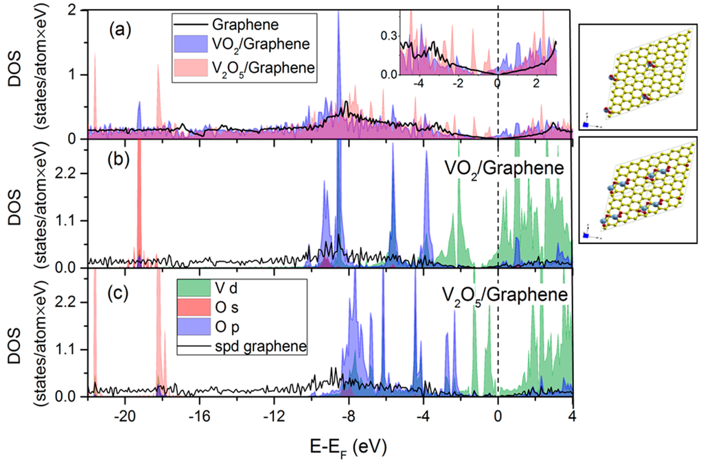 Density functional theory (DFT) calculations. Total electronic density of state (DOS) spectra per atom eV for (a) clean graphene, VO2/graphene, V2O5/graphene (4 × 4 graphene supercell); partial DOS spectra of (b) VO2/graphene and (c) V2O5/ graphene for V d, O 2s and O 2p orbitals and spd graphene. Schematics of graphene, vanadium oxide and vanadium pentoxide clusters on the 4 × 4 graphene supercell (top view, right panel). The vertical line is the Fermi level.