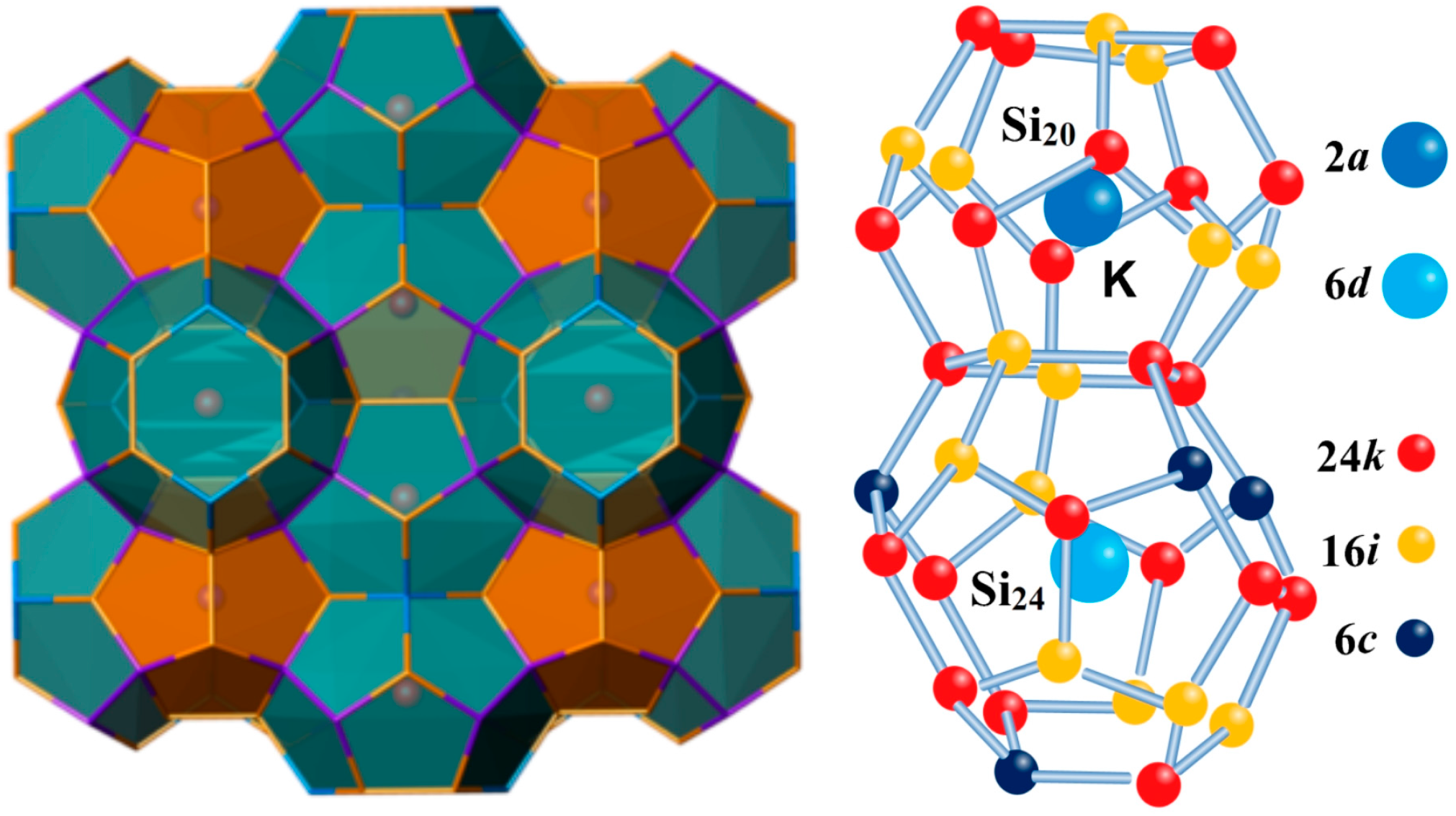 The sketch map of ball and stick representation of the type I clathrate K8Si46 with an illustration of Wyckoff sites of the structure.