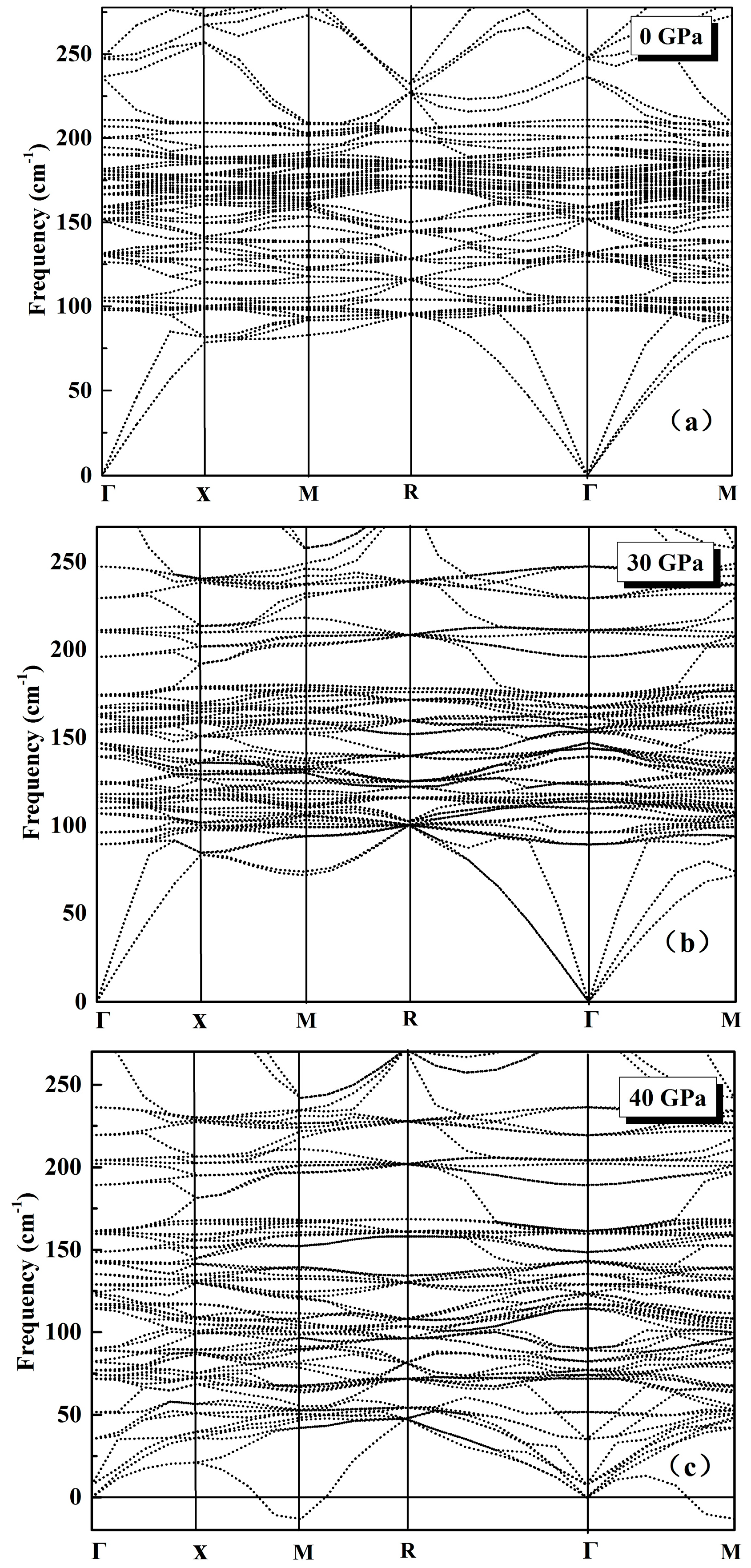 Within the framework of DFPT method, phonon frequencies are computed as second-order derivatives of the total energy with respect to a given perturbation in the form of atomic displacements. The force constants matrix can be obtained by differentiating the Hellmann-Feynman forces on atoms with respect to ionic coordinates. Based on the interatomic force constants, we can obtain the phonon spectra by using Fourier interpolation with specific treatment of the long-range dipole-dipole interaction [35]. The phonon band structure calculations were performed up to 40 GPa with an interval of 10 GPa. A more careful calculation at 39 GPa was performed for determining the exact pressure value when the phonon became instable.