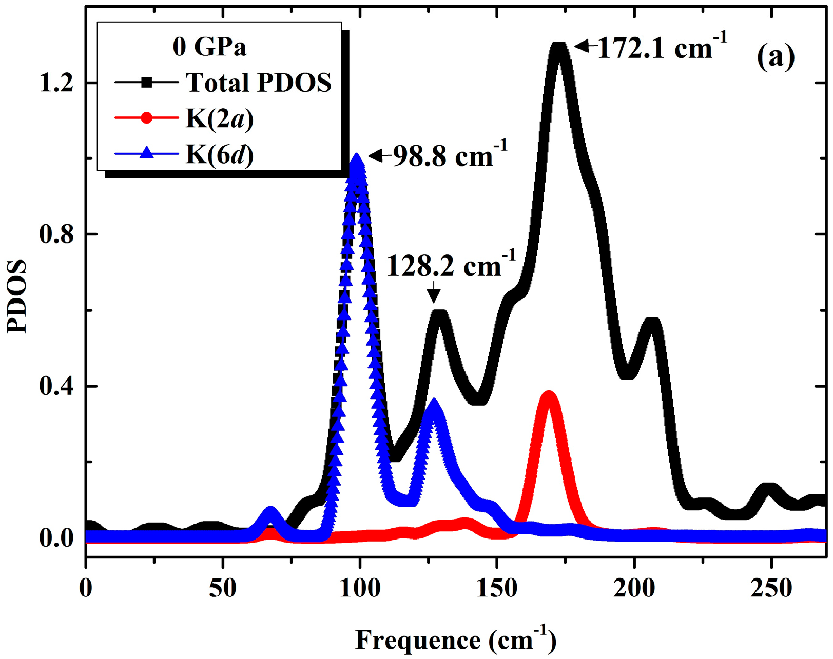 where kB is the Boltzmann constant. ħ is Planck’s constant and f(ω) is the phonon density of states (PDOS). Through a series calculation of PDOS of K8Si46 with different volumes, the volume dependence of Helmholtz free energy Fvib(V,T) can be obtained. Then the vibrational contribution to the entropy, the specific heat at constant volume and isothermal bulk modulus can be derived by: