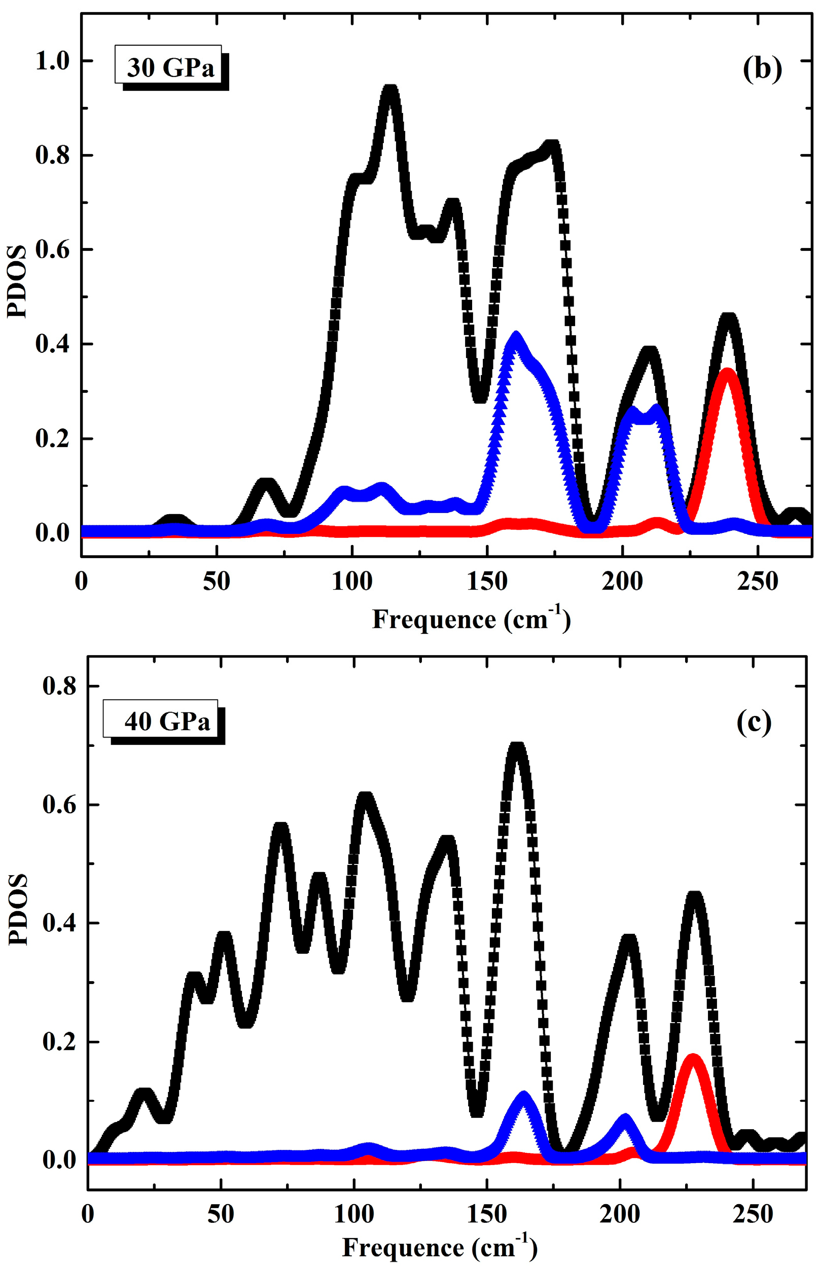 The partial phonon density of state of K8Si46 at (a) 0 GPa; (b) 30 GPa and (c) 40 GPa.