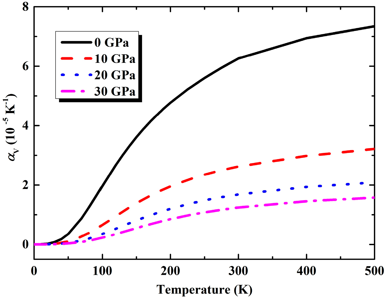 The calculated variation of volume coefficient of thermal expansion of K8Si46 with temperature under 0, 10, 20 and 30 GPa.