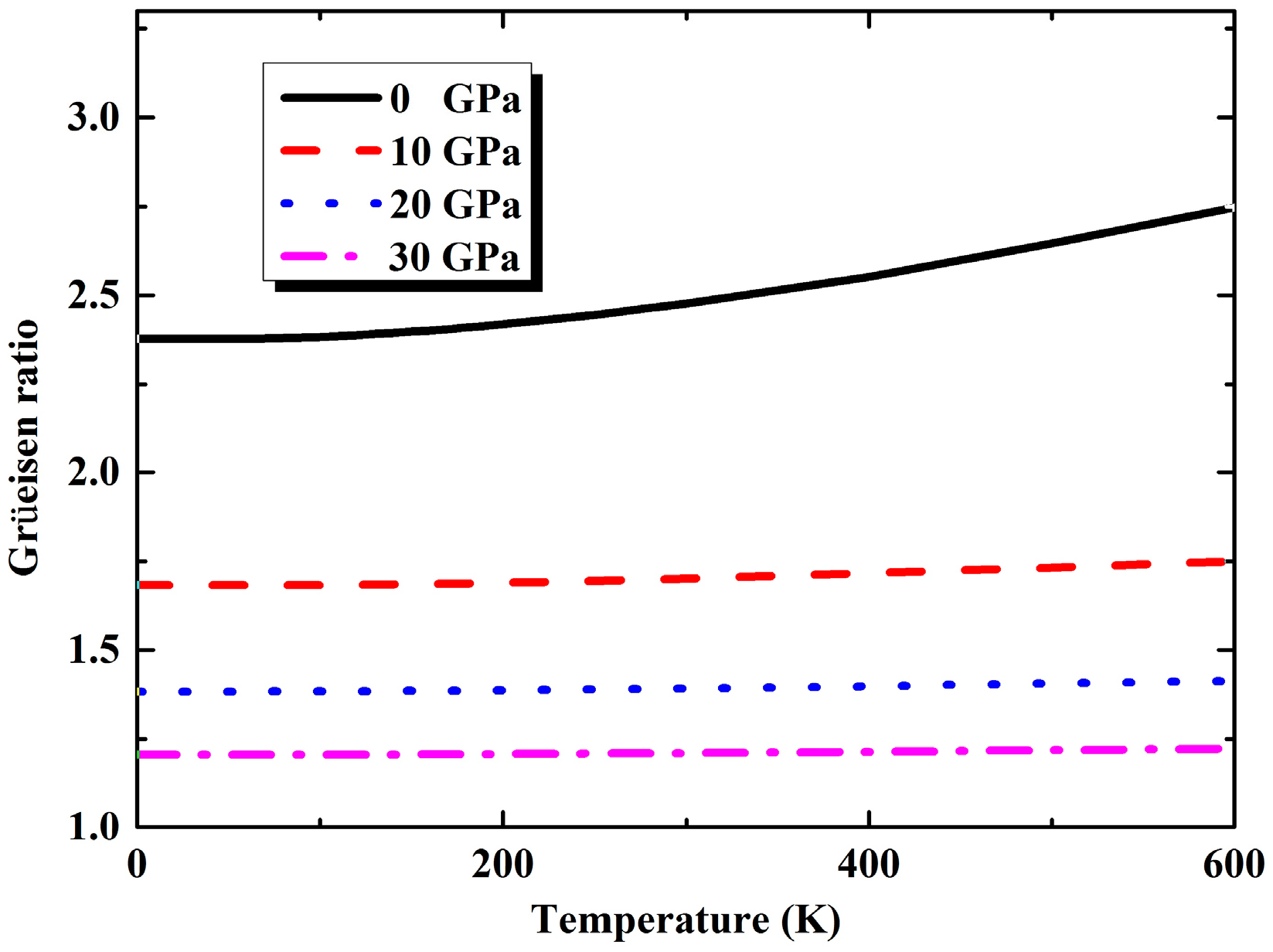The calculated variation of Grüneisen parameters of K8Si46 with temperature under 0, 10, 20 and 30 GPa.